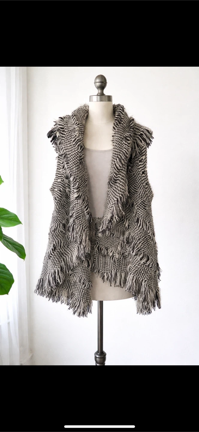 Stylish black and white knit vest with a fringed design. It's sleeveless and perfect for layering. This piece adds texture and a unique flair to any outfit!