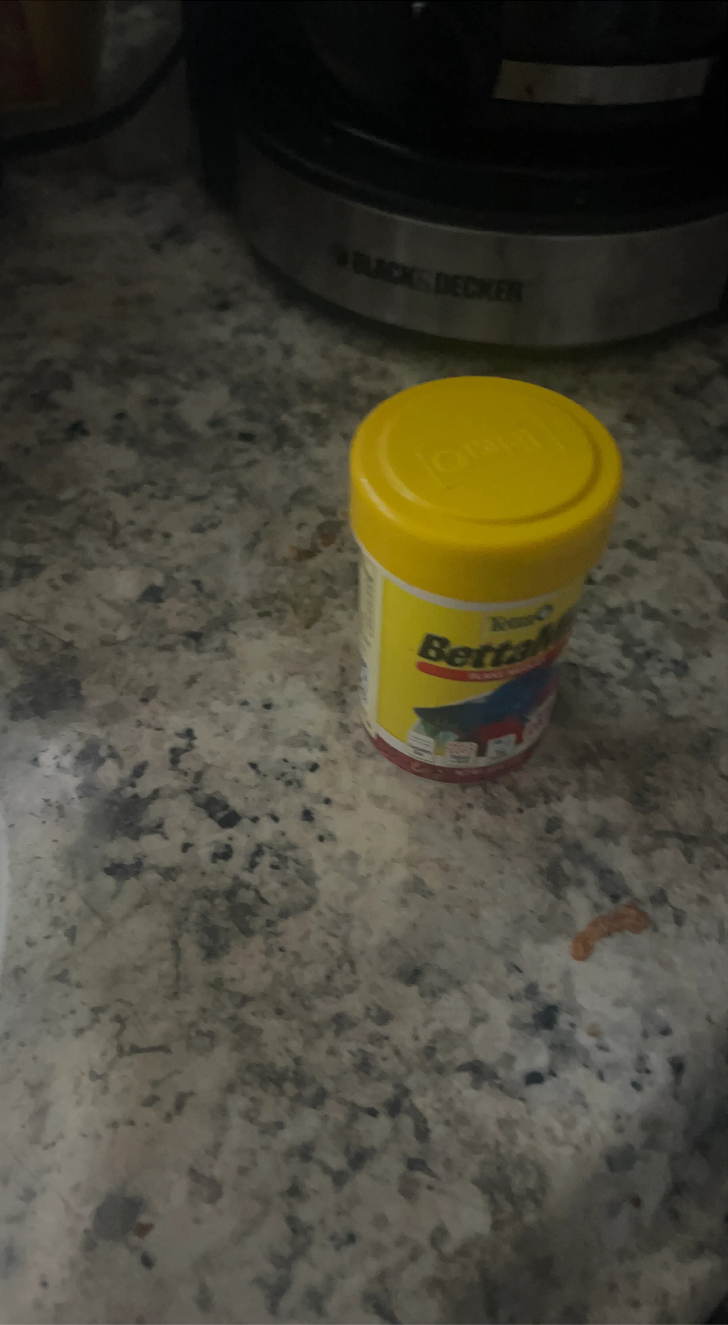 This is Tetra BettaMin fish food flakes for betta fish. It's in a yellow container with a red lid. The container has graphics of fish on it.