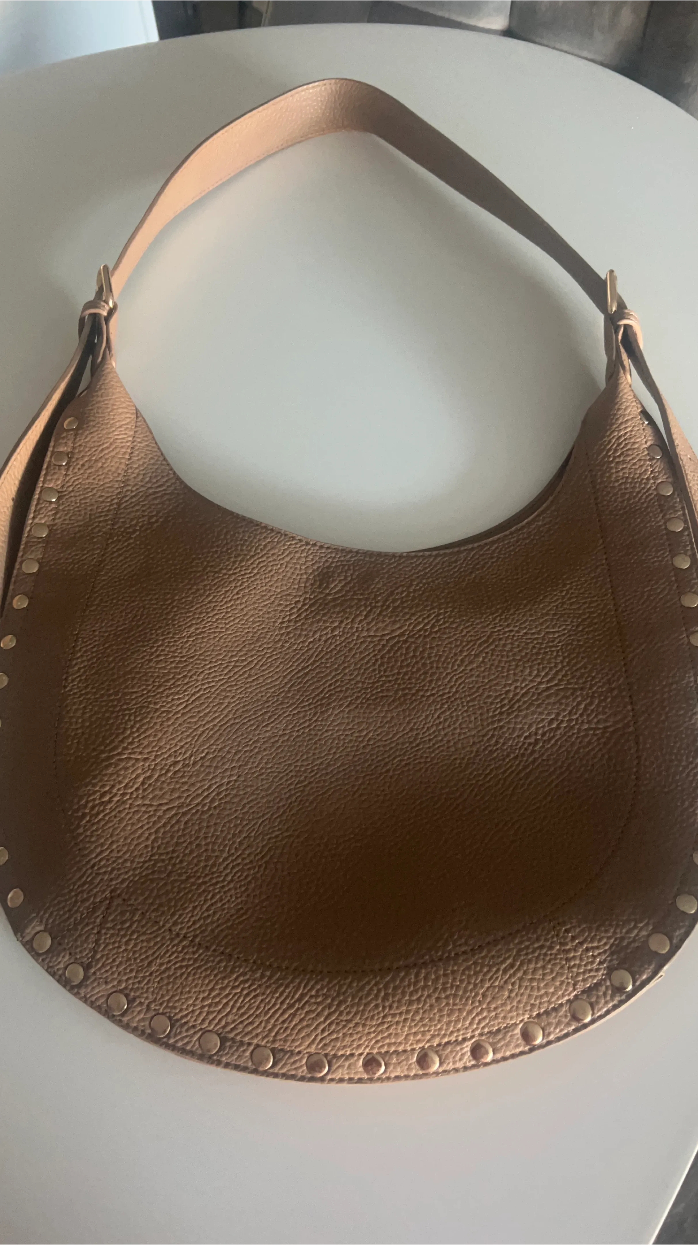 A stylish brown leather hobo bag. It features gold-tone stud detailing along the bottom edge and a single adjustable shoulder strap. The pebbled leather finish adds texture. It's a great everyday bag!