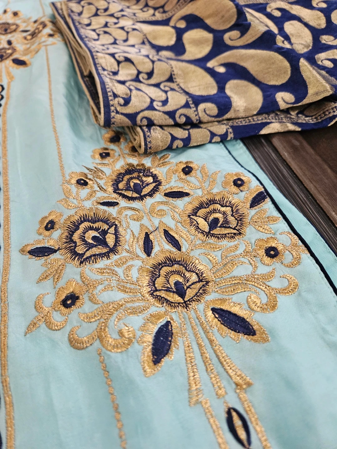 Beautiful light blue Punjabi suit with intricate gold and navy embroidery. Includes the kurta, pants, and a coordinating dupatta with paisley patterns. Perfect for a special occasion!