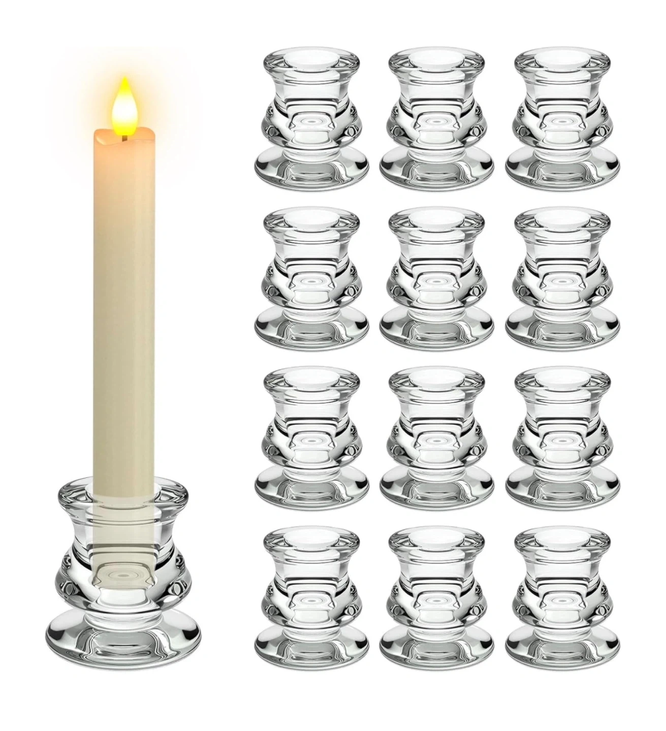 These glass candlestick holders are perfect for taper candles. They're made of clear glass and come as a set of 12. These would be great for adding ambiance to dinner parties or special occasions!