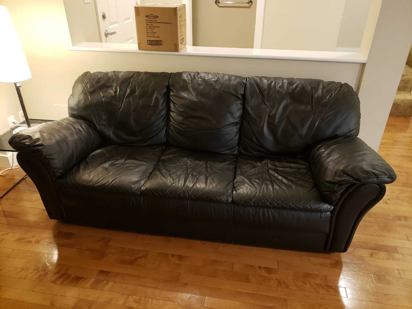 Selling a comfortable black leather sofa. It's in good condition and ready for a new home! Perfect for a living room or den. Please message if interested