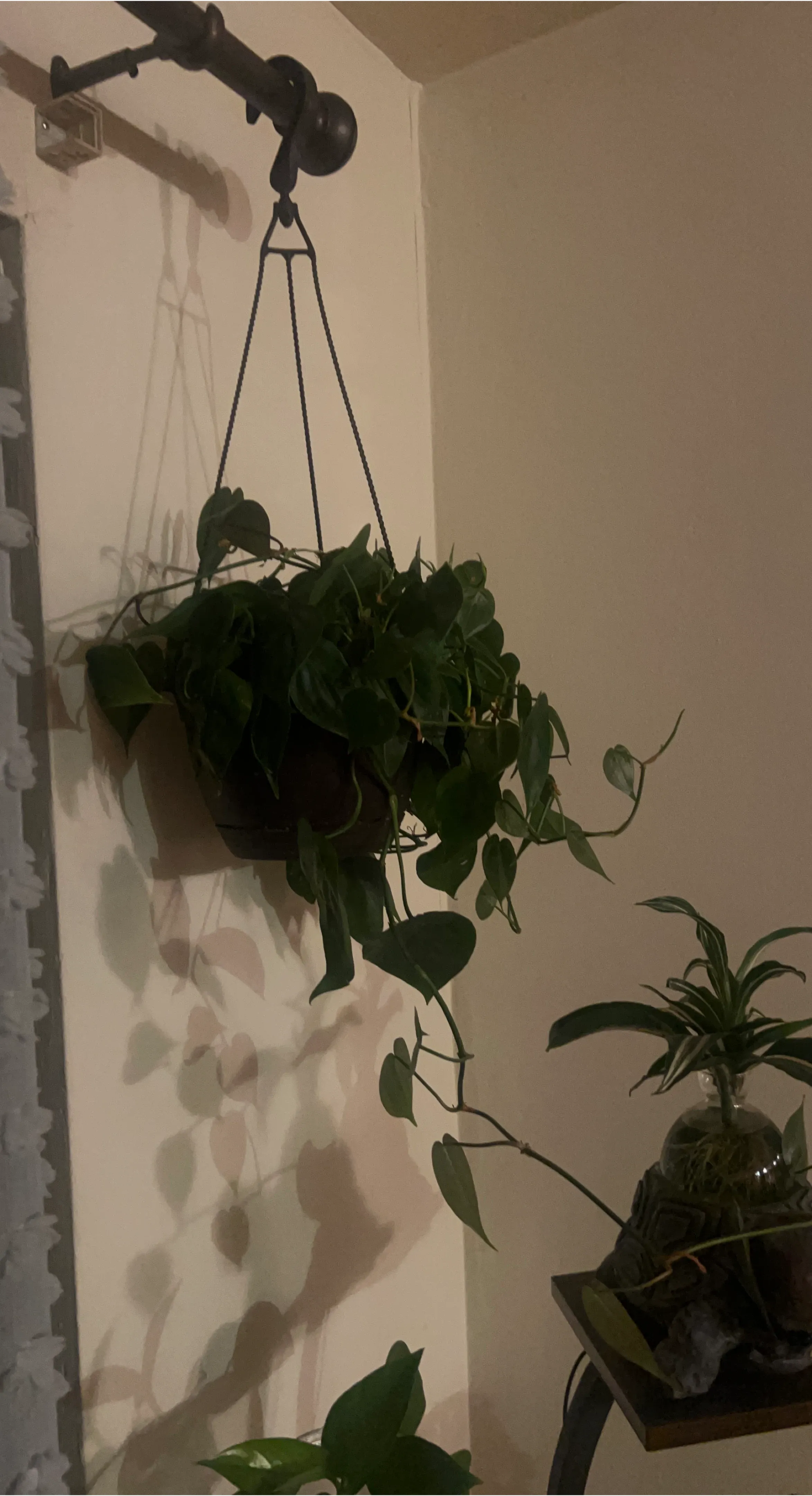 This is a lush, hanging heartleaf philodendron plant. It's in a dark, round planter with a chain hanger. The vines trail nicely, adding greenery to any space. This plant is a great addition for indoor plant lovers!