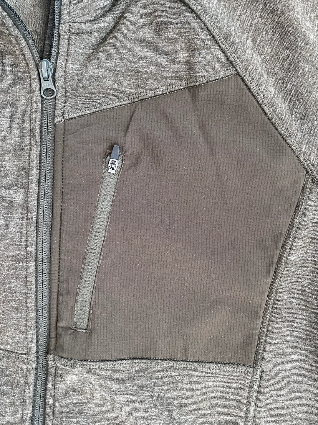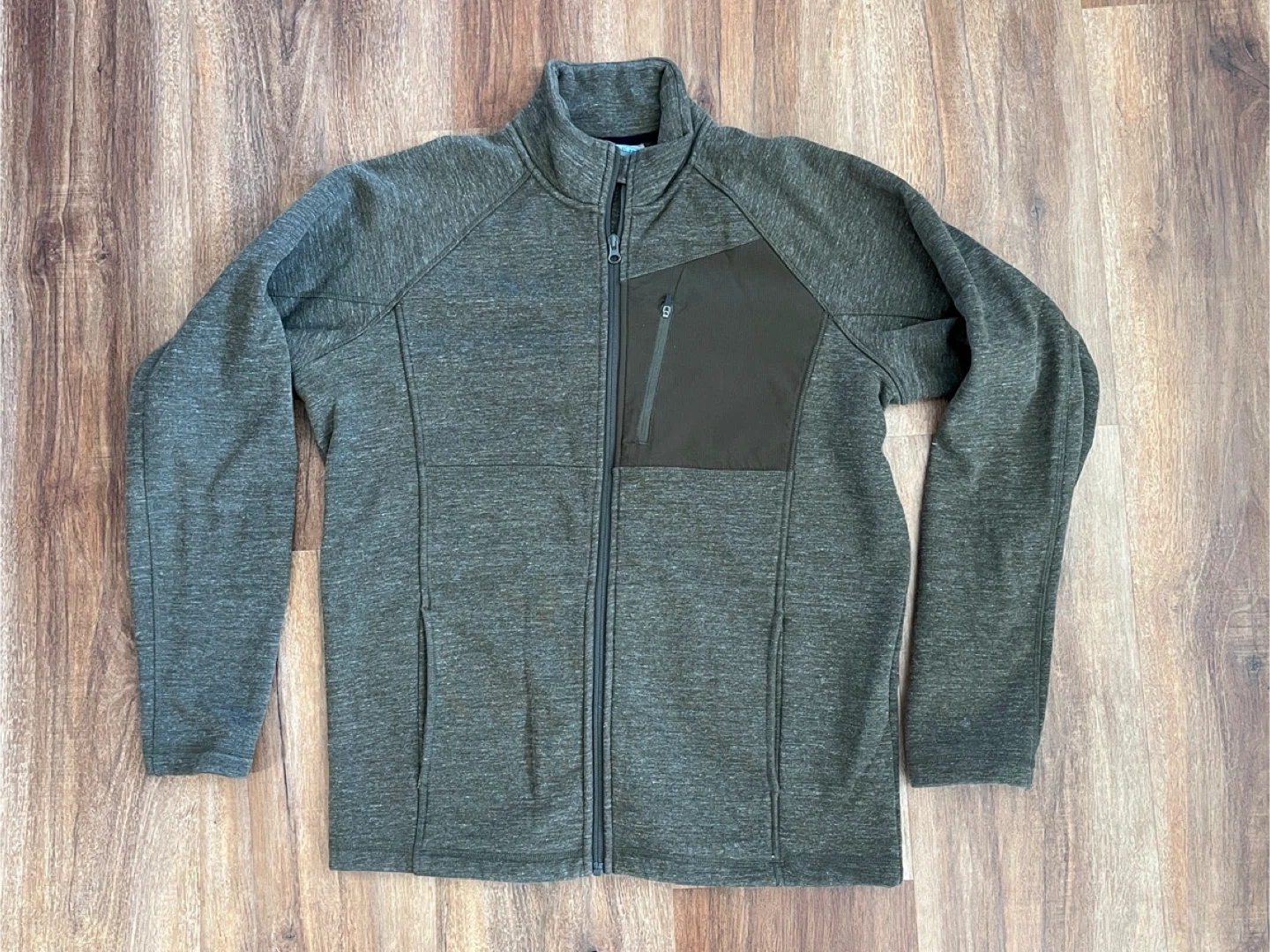 This Mondetta fleece jacket is designed for comfort and practicality. It features a full zip closure and a chest pocket with a zipper. The jacket's material is a heathered knit fleece. This would be useful for layering during cooler weather.