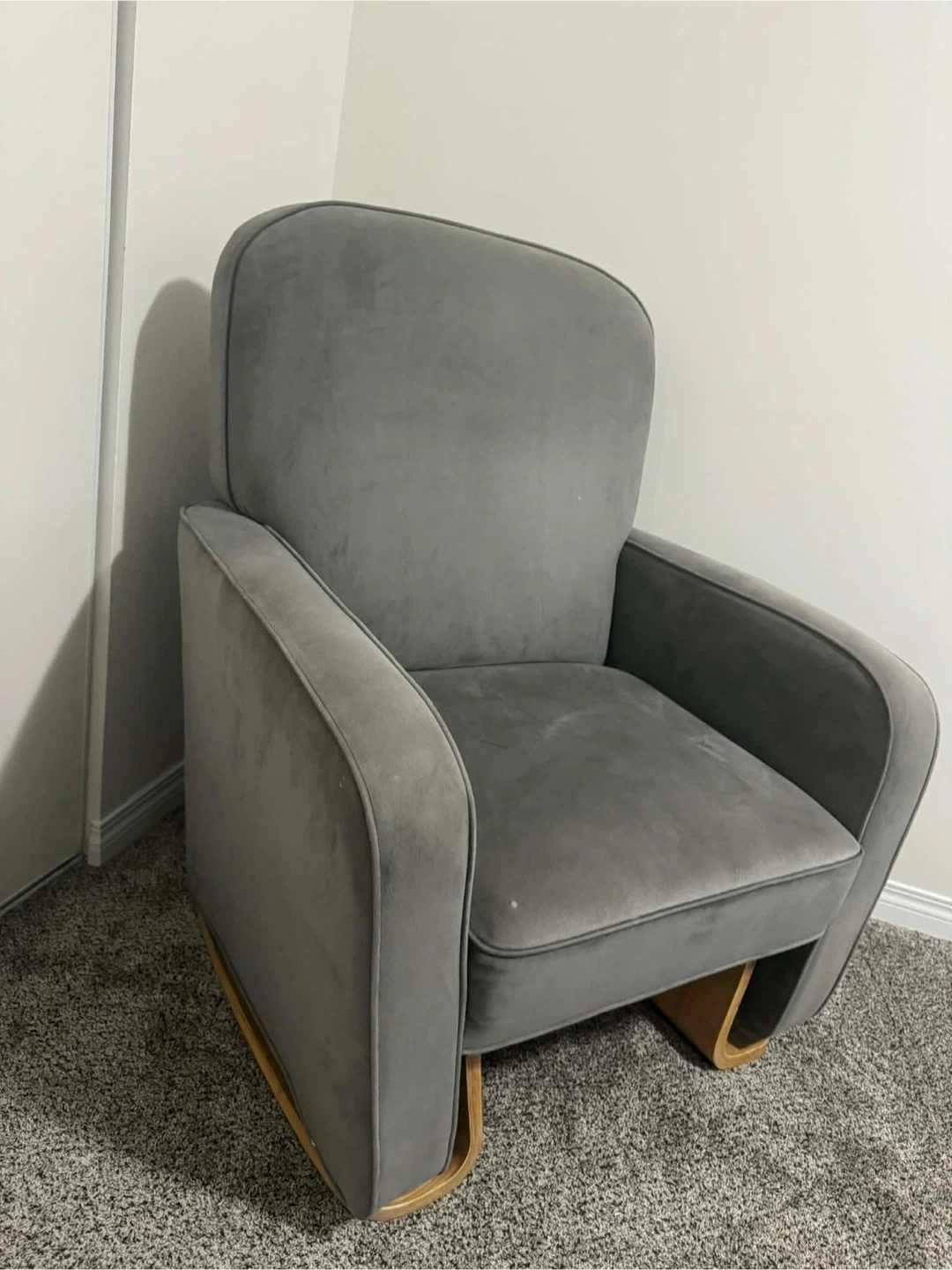 A comfortable grey upholstered rocker chair. It has a smooth velvet-like fabric and a wooden base. This chair is perfect for a nursery or a cozy reading nook.