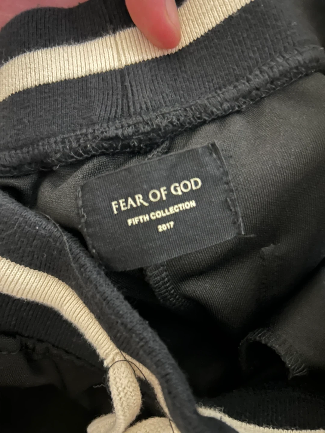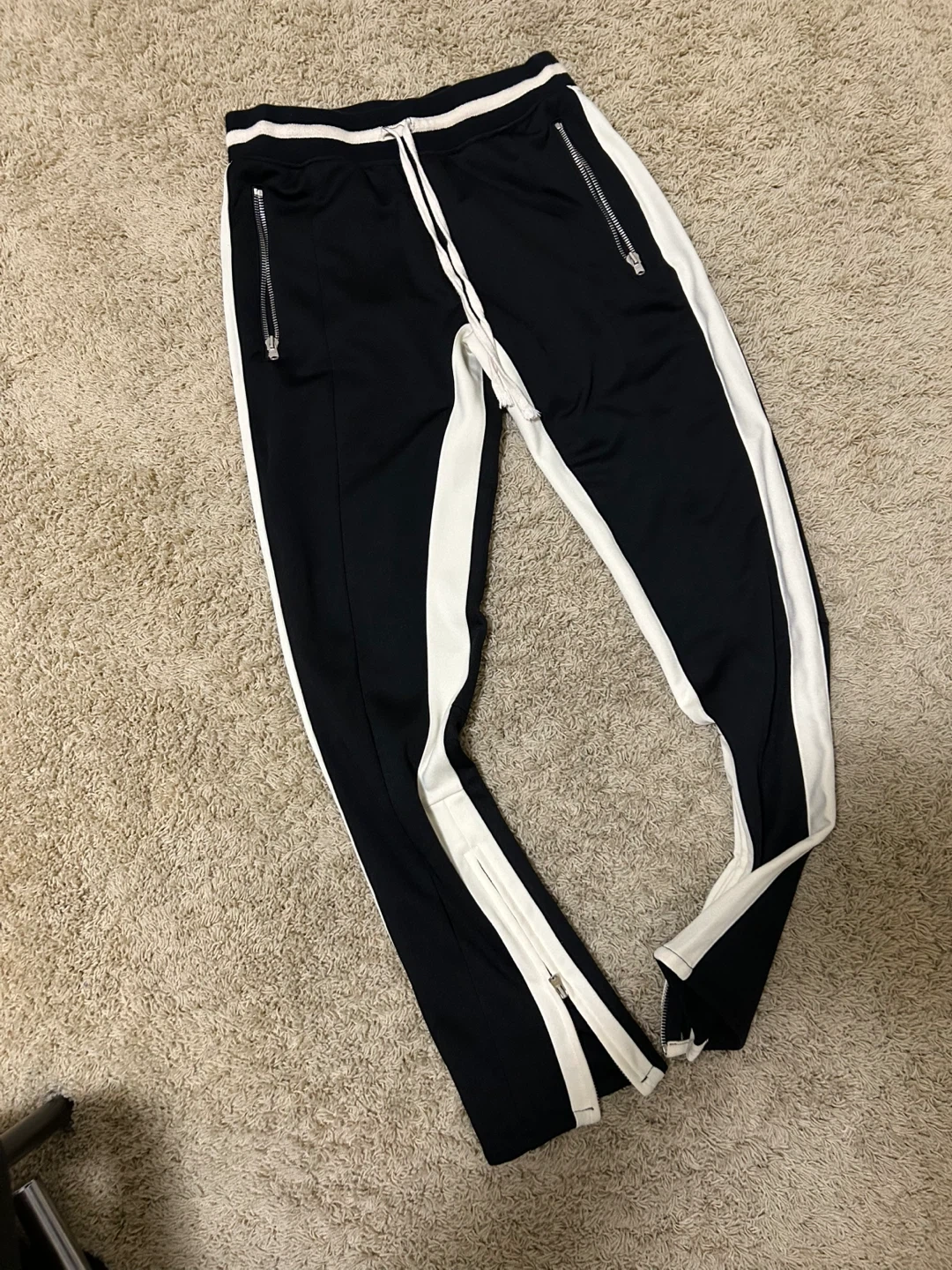 Black track pants from Fear of God's Fifth Collection. Size medium with white side stripes and zippered ankles. These pants feature zippered pockets.