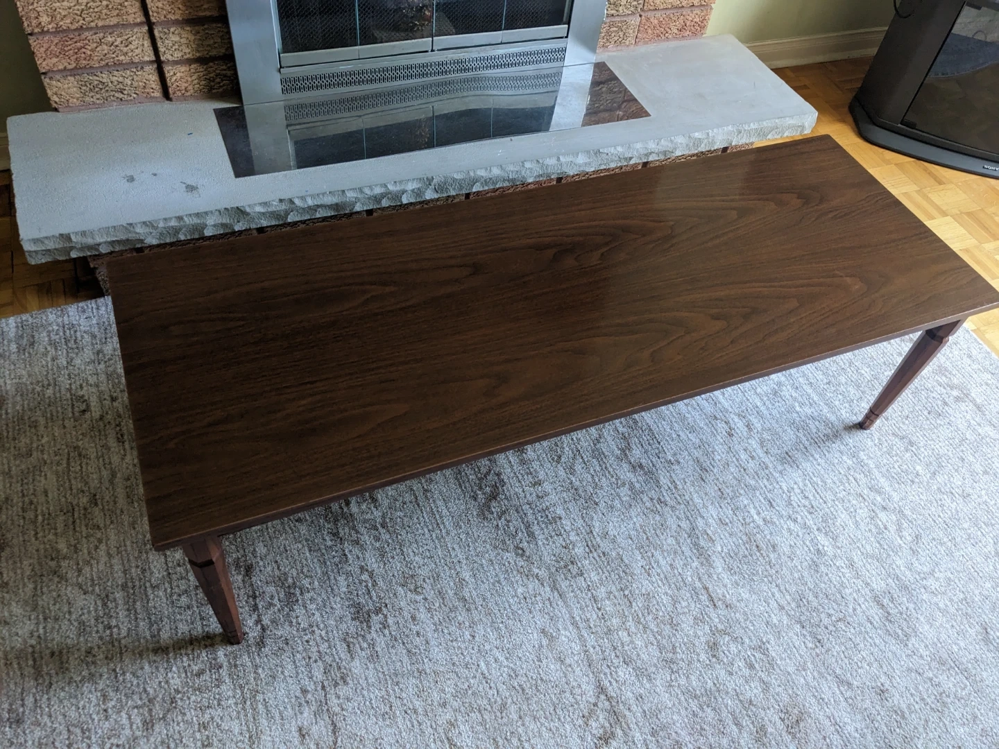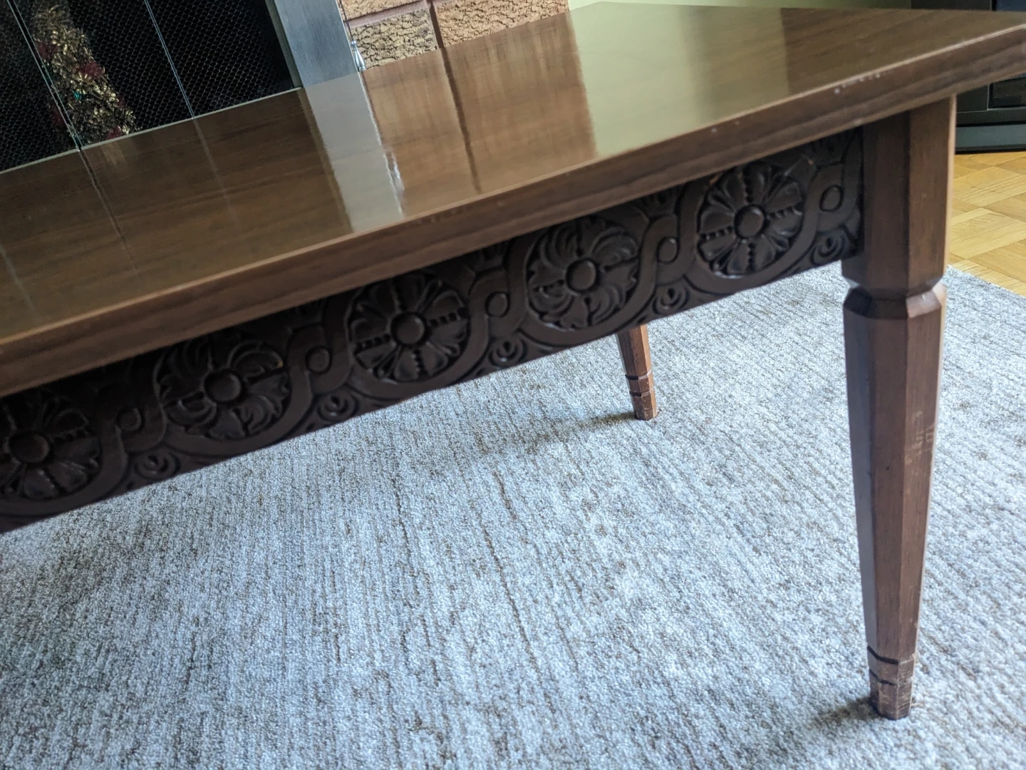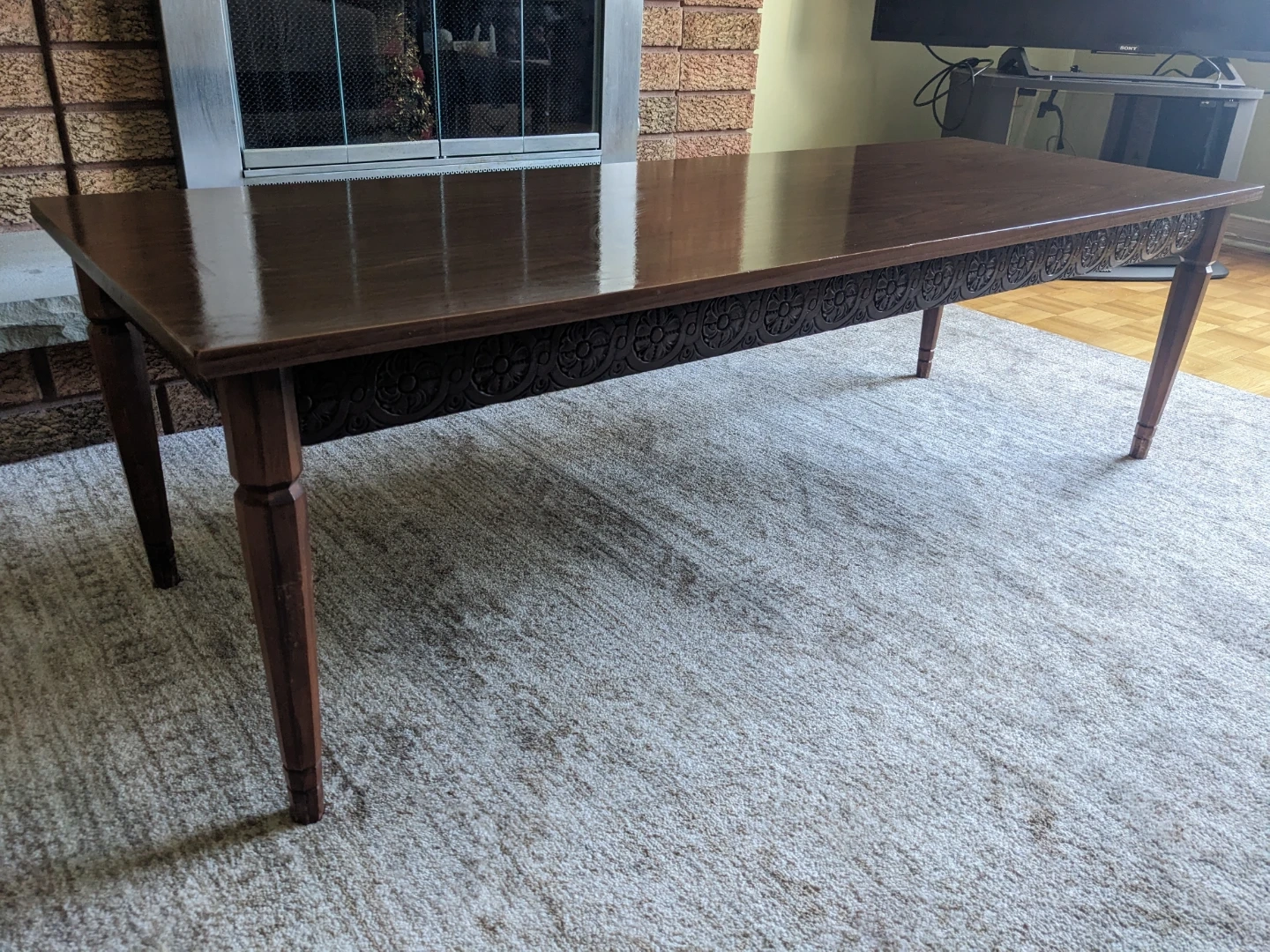 A dark brown wooden coffee table featuring intricate carved detailing along the apron. Its polished surface reflects light beautifully. Perfect for a living room space.
