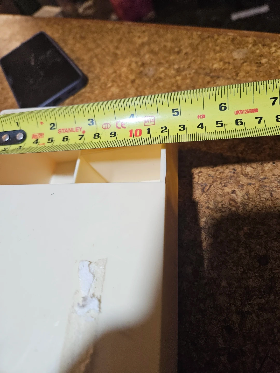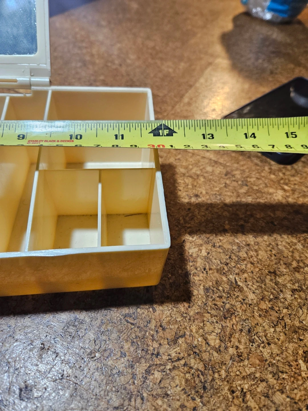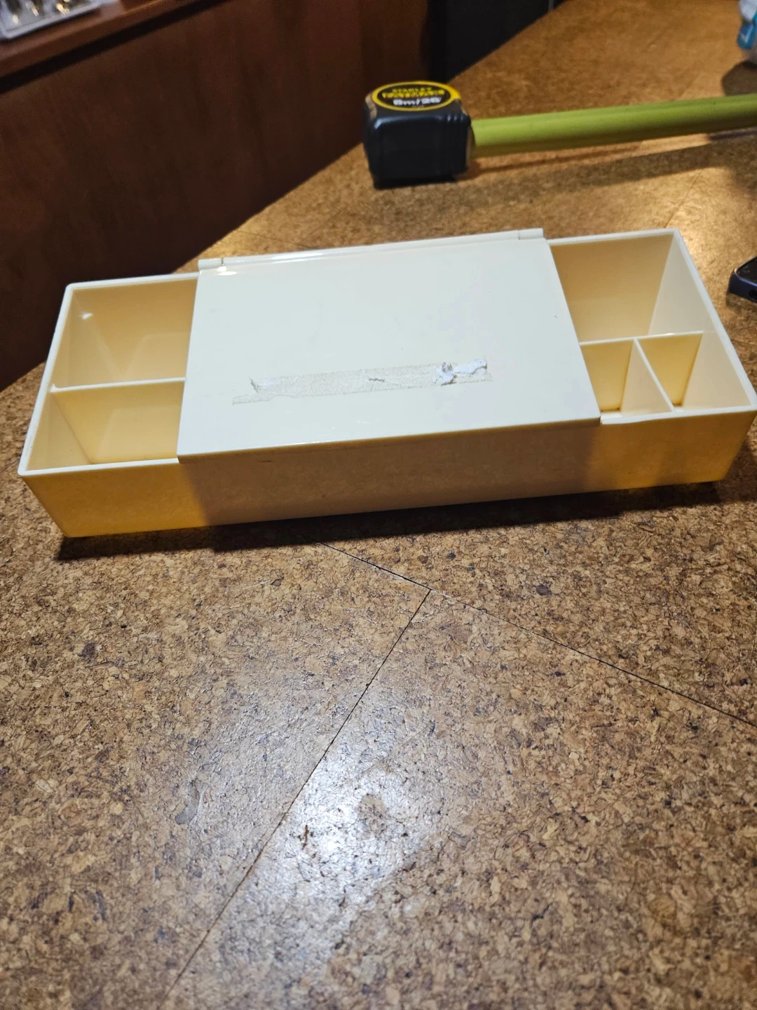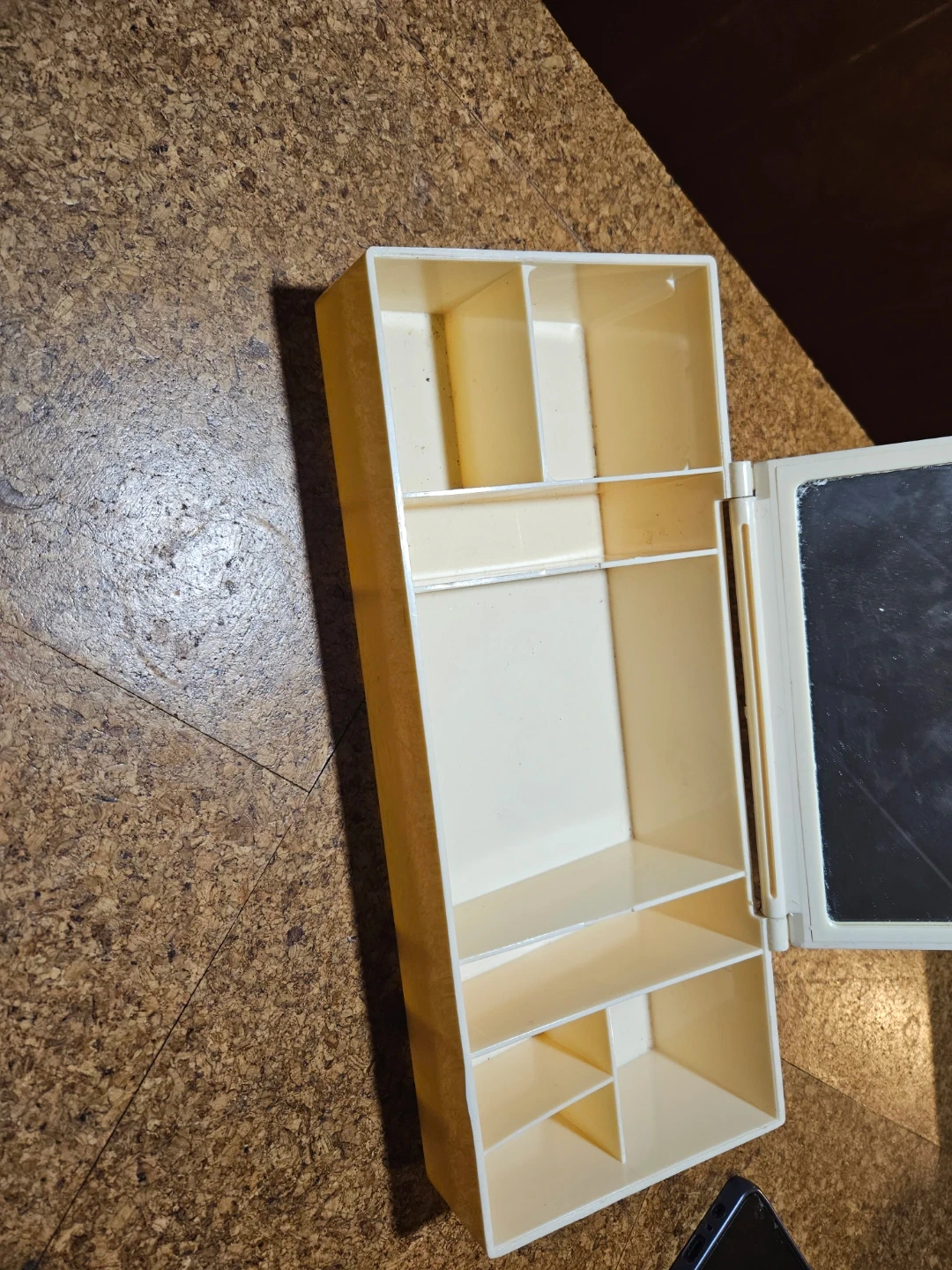 Cream coloured plastic makeup organizer. It has multiple compartments for storage and a hinged mirror. Organizer measures approximately 11 inches long.