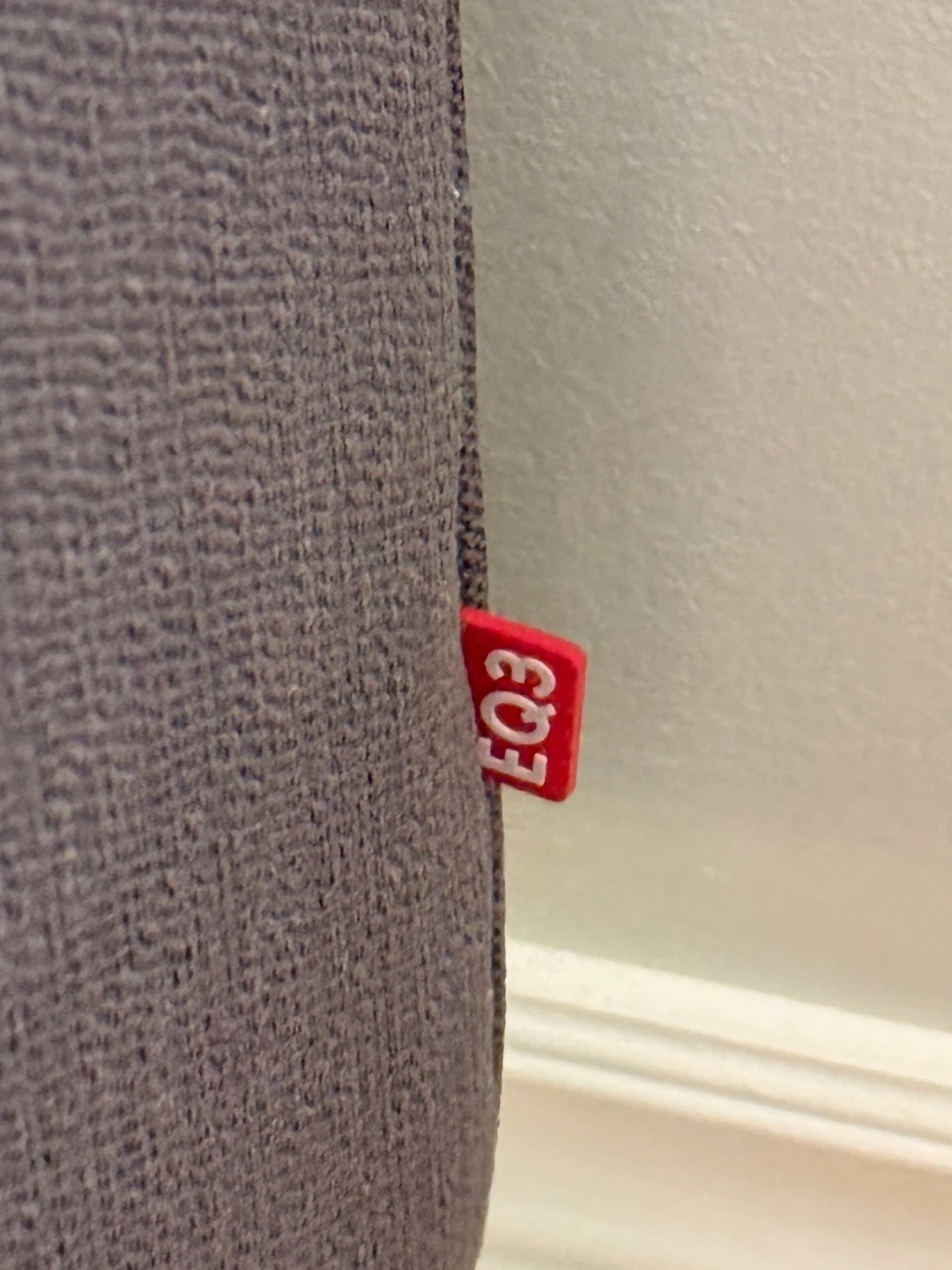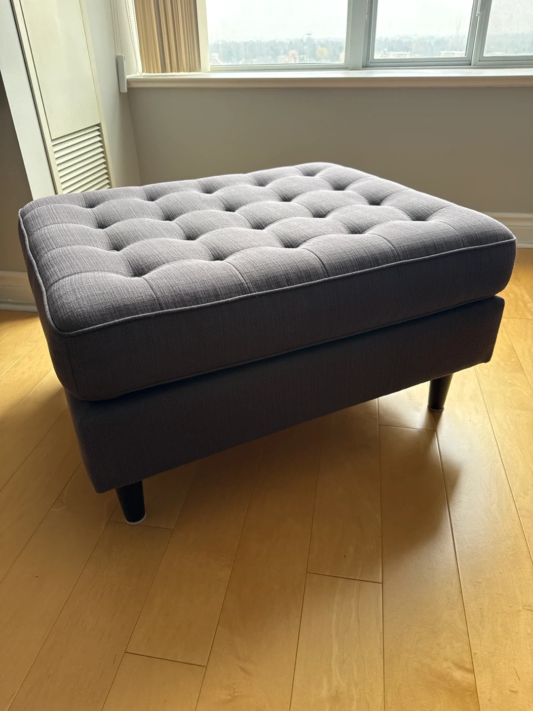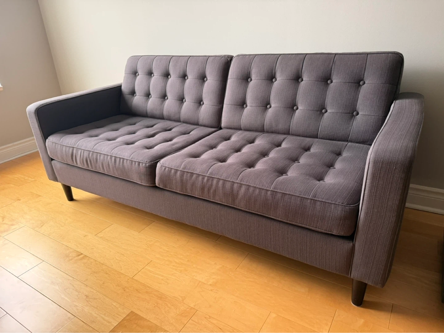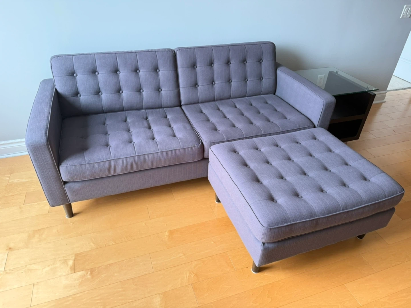 Grey upholstered Reverie sofa from EQ3 with tufted seat and back cushions. Includes matching tufted ottoman. Pick up only, no delivery.