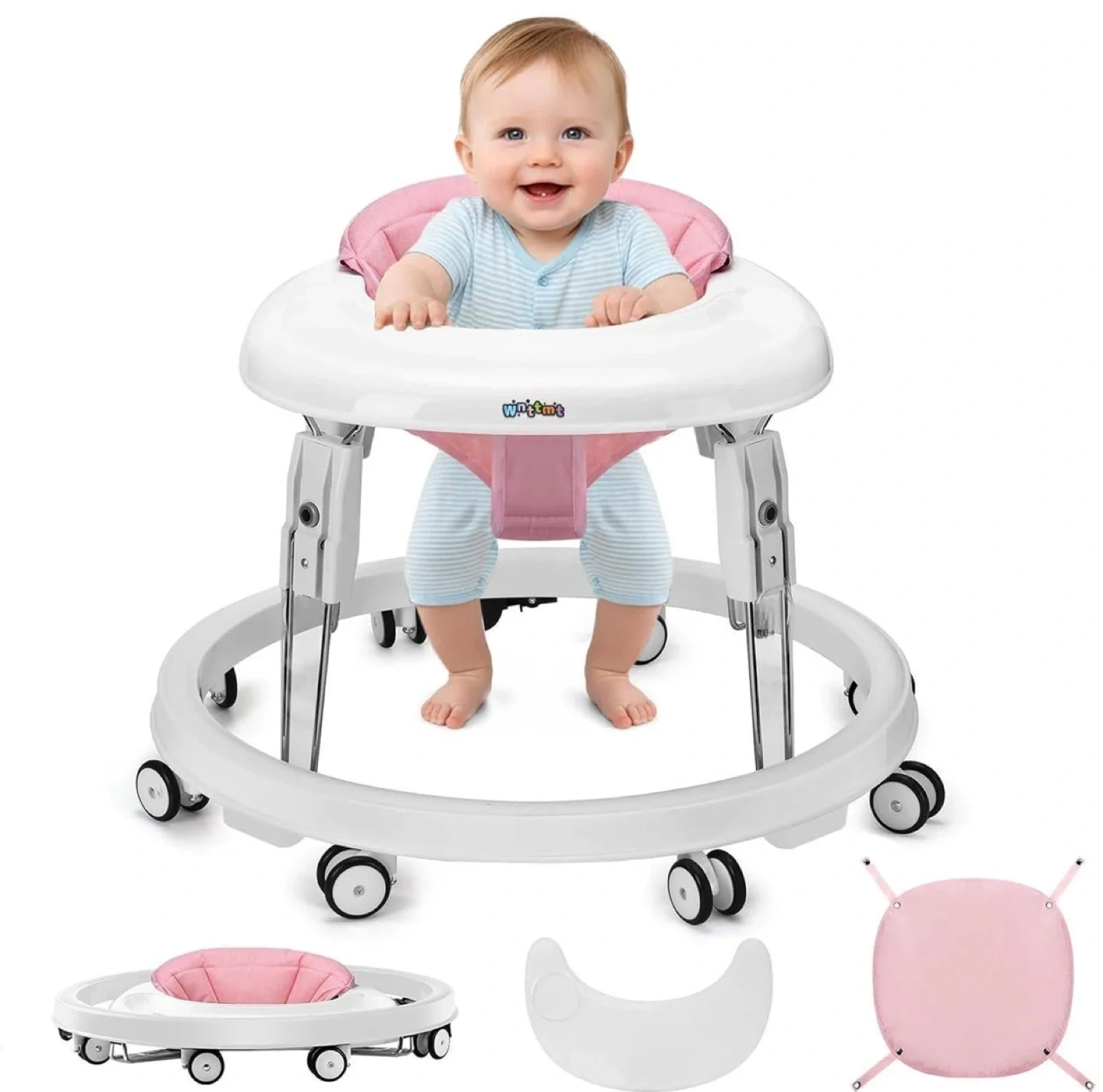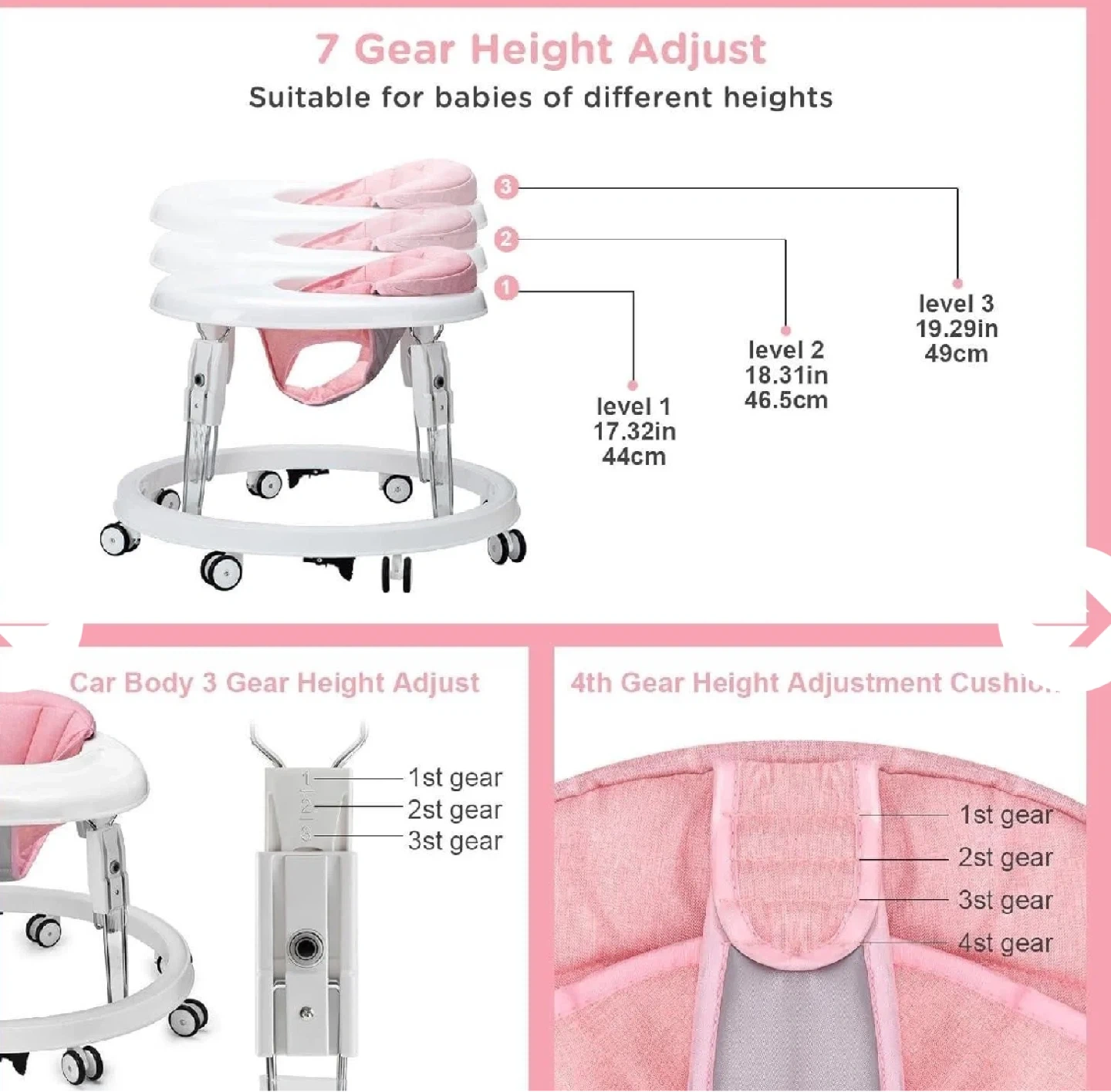 This baby walker offers 7 gears of height adjustment, suitable for babies of different heights. It features a car body with 3 gear height adjustments and a 4th gear adjustment for the cushion. Includes a tray and removable seat.