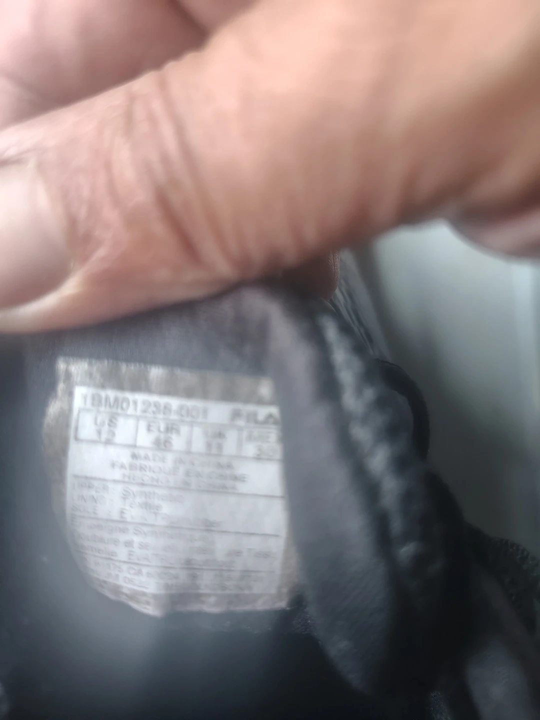 Fila men's black athletic sneakers. Size 12 US, 11 UK, 46 EUR. Synthetic upper and sole. Lace-up closure.