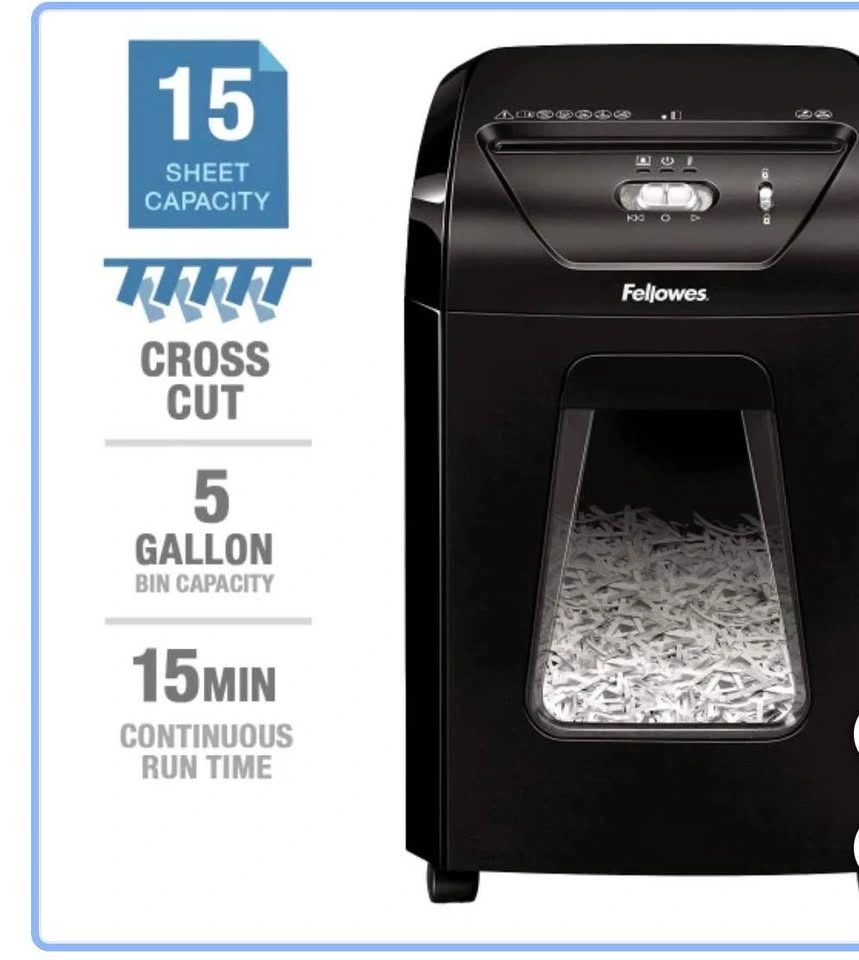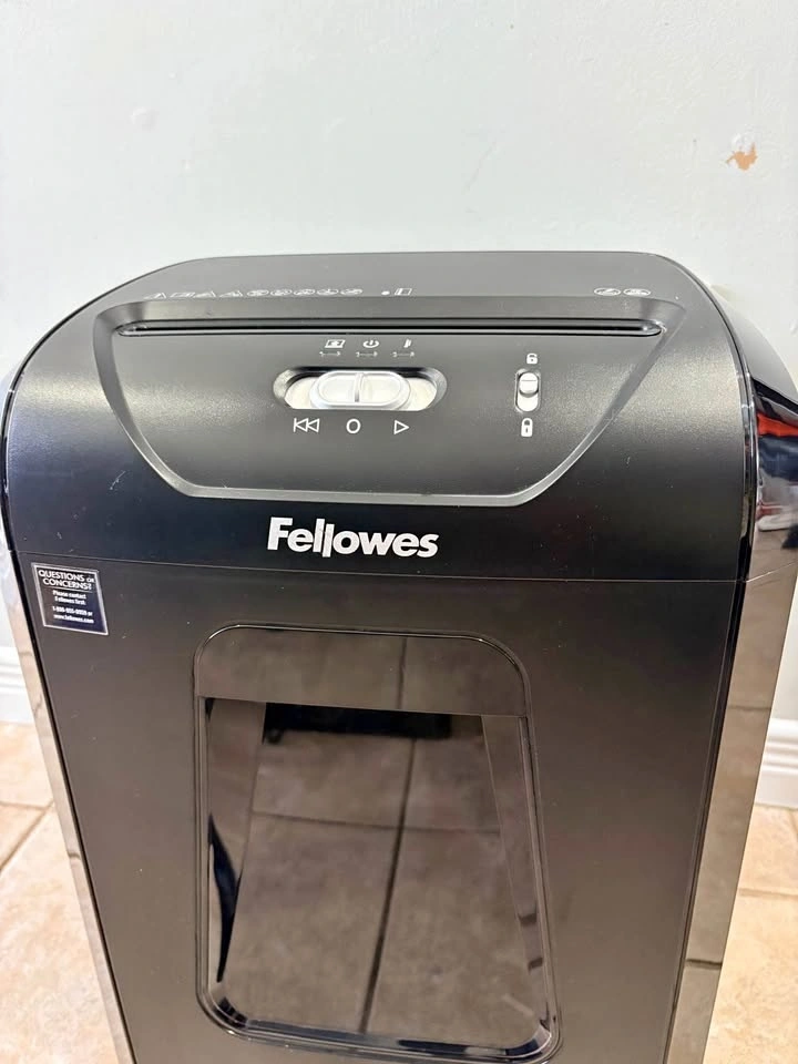 Efficient Fellowes paper shredder with cross-cut shredding for good security. Handles up to 15 sheets at once and comes with a 5-gallon bin. Good for 15 minutes of continuous run time. Pickup in the Huron area, Kitchener, opposite Huron Heights Secondary School.