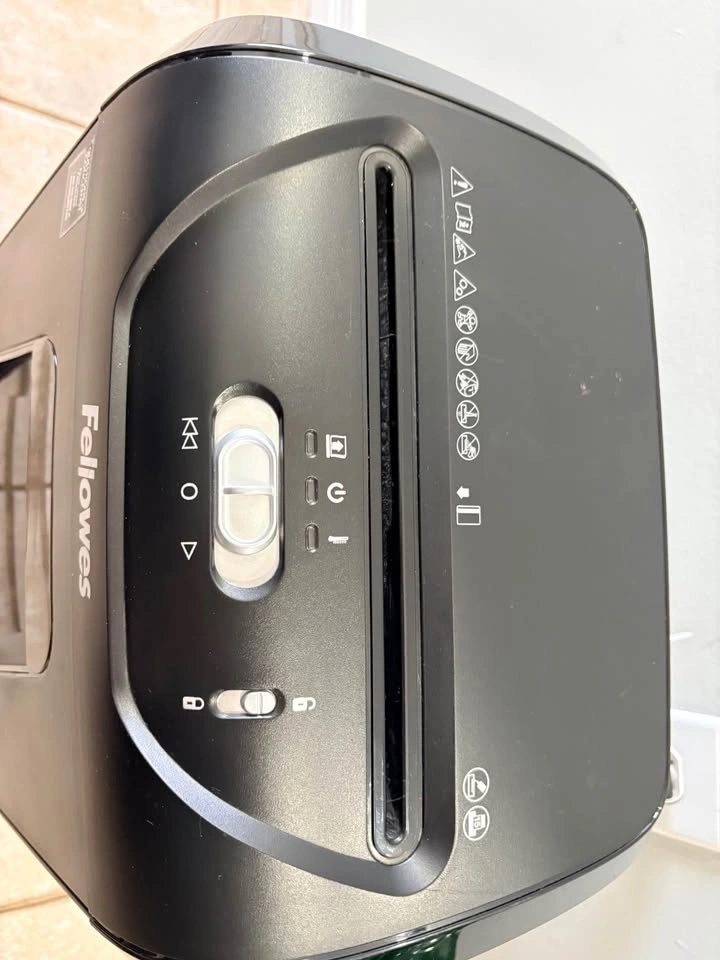 Efficient Fellowes paper shredder with cross-cut shredding for good security. Handles up to 15 sheets at once and comes with a 5-gallon bin. Good for 15 minutes of continuous run time. Pickup in the Huron area, Kitchener, opposite Huron Heights Secondary School.