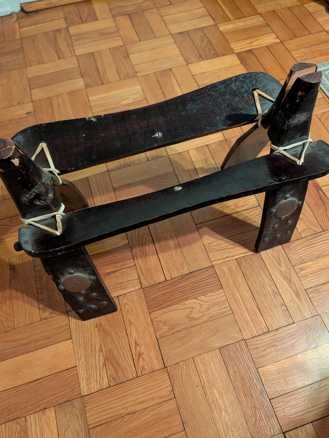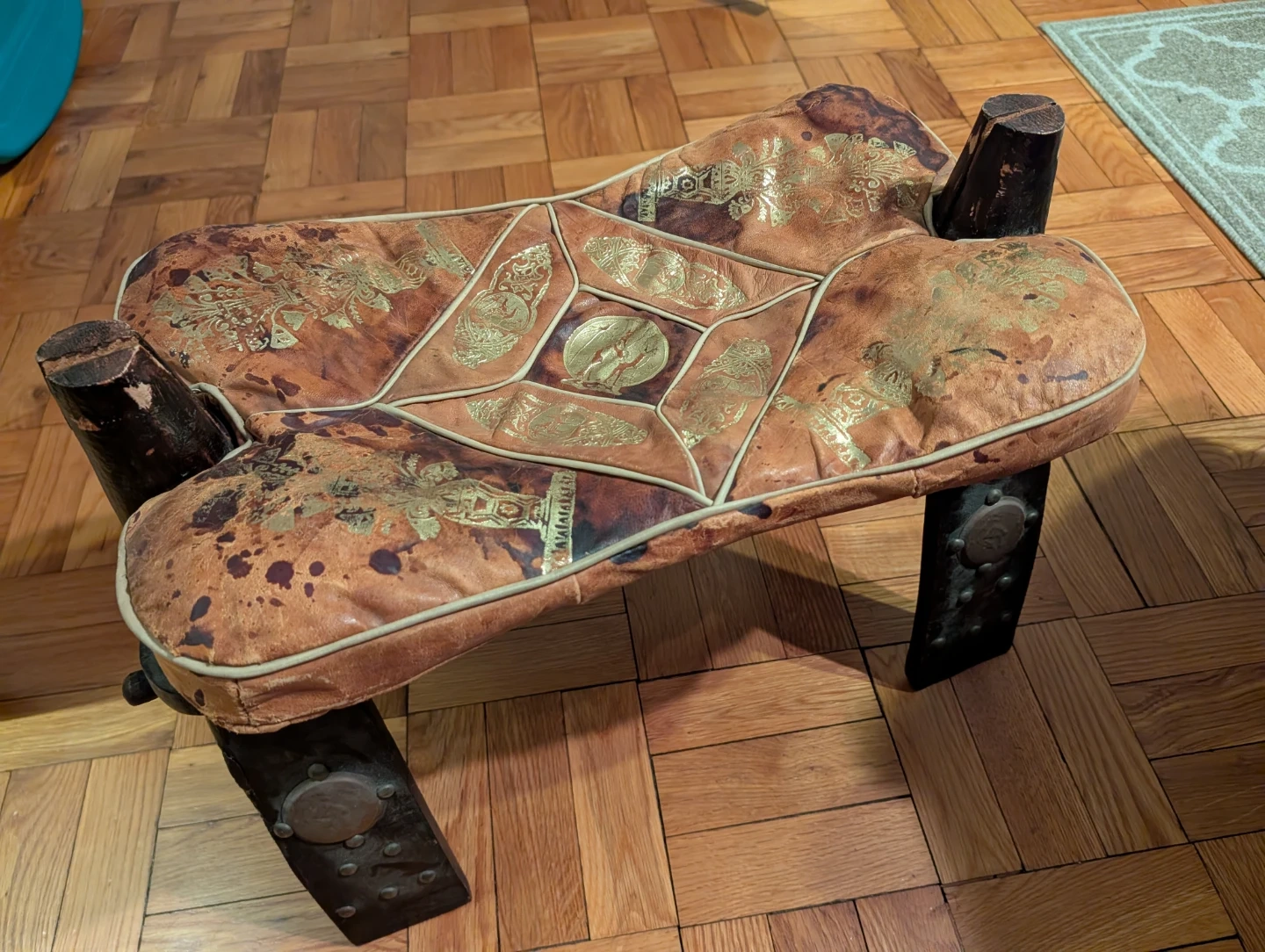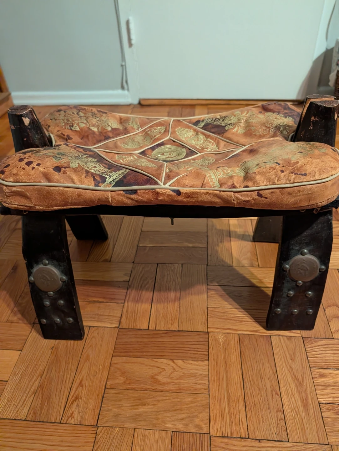 This unique camel seat features a leather seat with embossed gold detailing. The dark wooden legs provide a sturdy base. It's a vintage collectible item. Serious inquiries only.