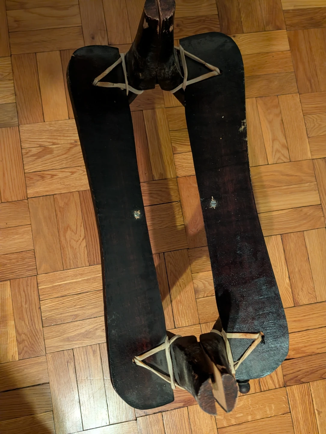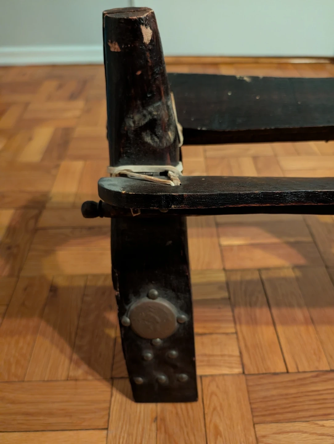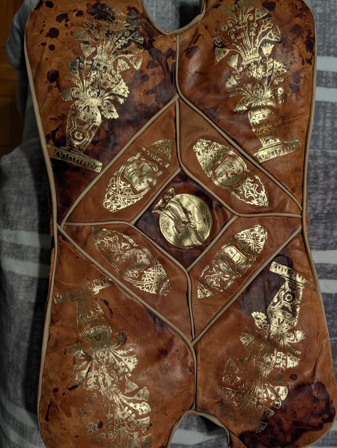 This unique camel seat features a leather seat with embossed gold detailing. The dark wooden legs provide a sturdy base. It's a vintage collectible item. Serious inquiries only.