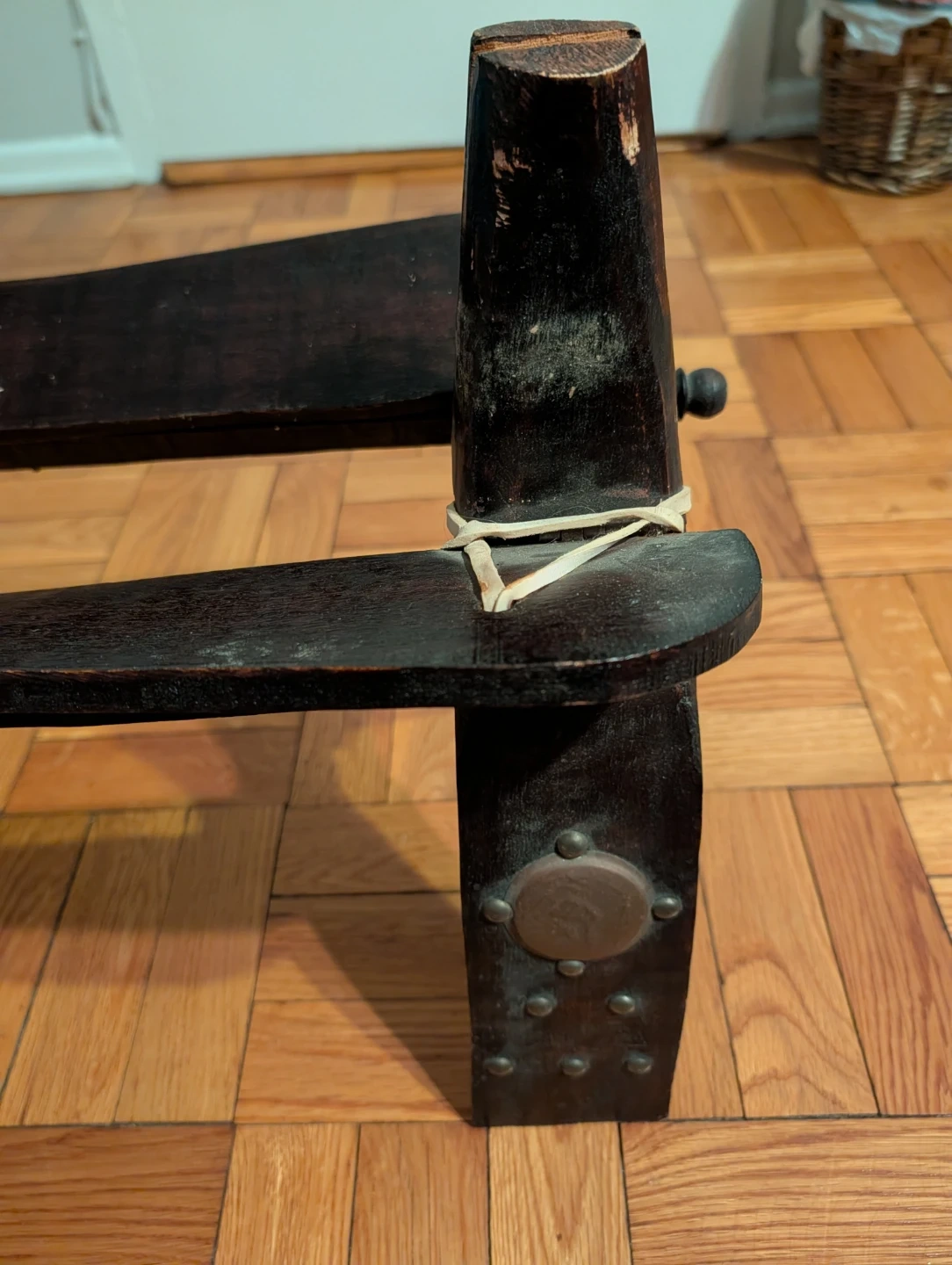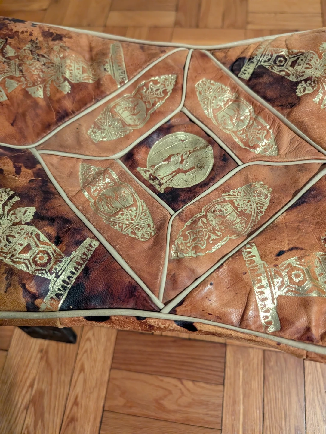 This unique camel seat features a leather seat with embossed gold detailing. The dark wooden legs provide a sturdy base. It's a vintage collectible item. Serious inquiries only.