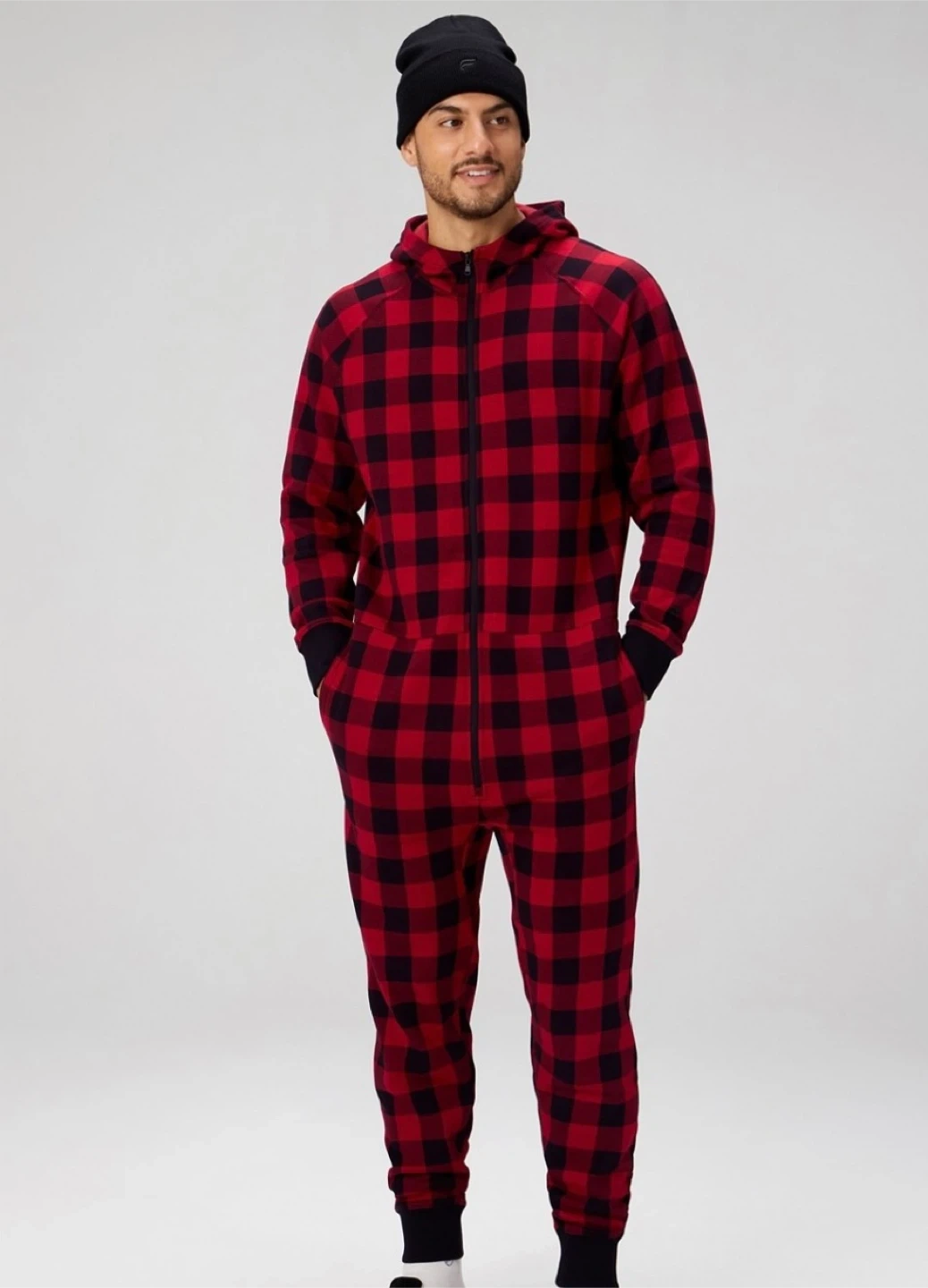 Cozy up in this Fabletics onesie! It's a red and black buffalo check pattern. This fleece hooded onesie is brand new and comes in its original packaging