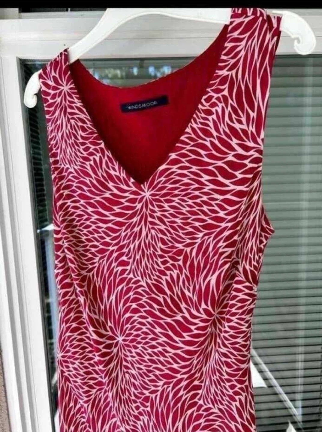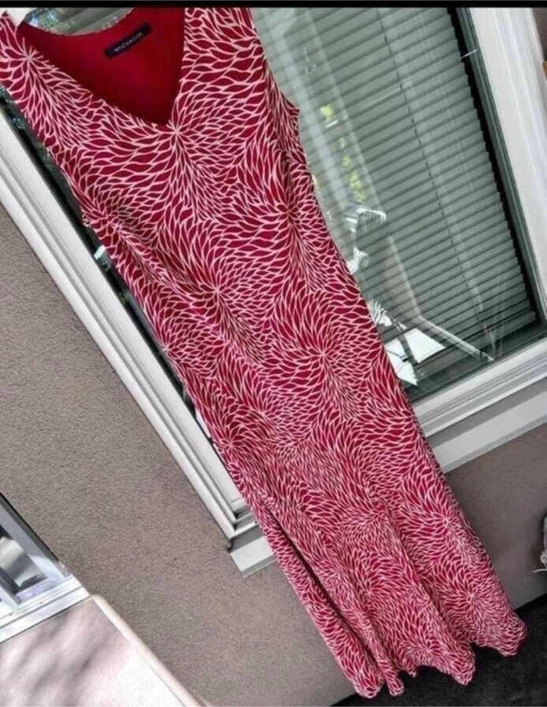 This size large maxi dress features a vibrant red background with a contrasting white floral print. Perfect for all occasions!