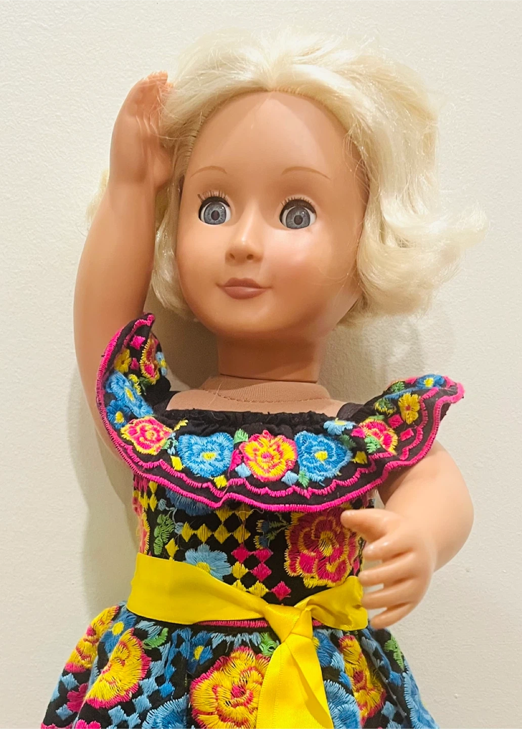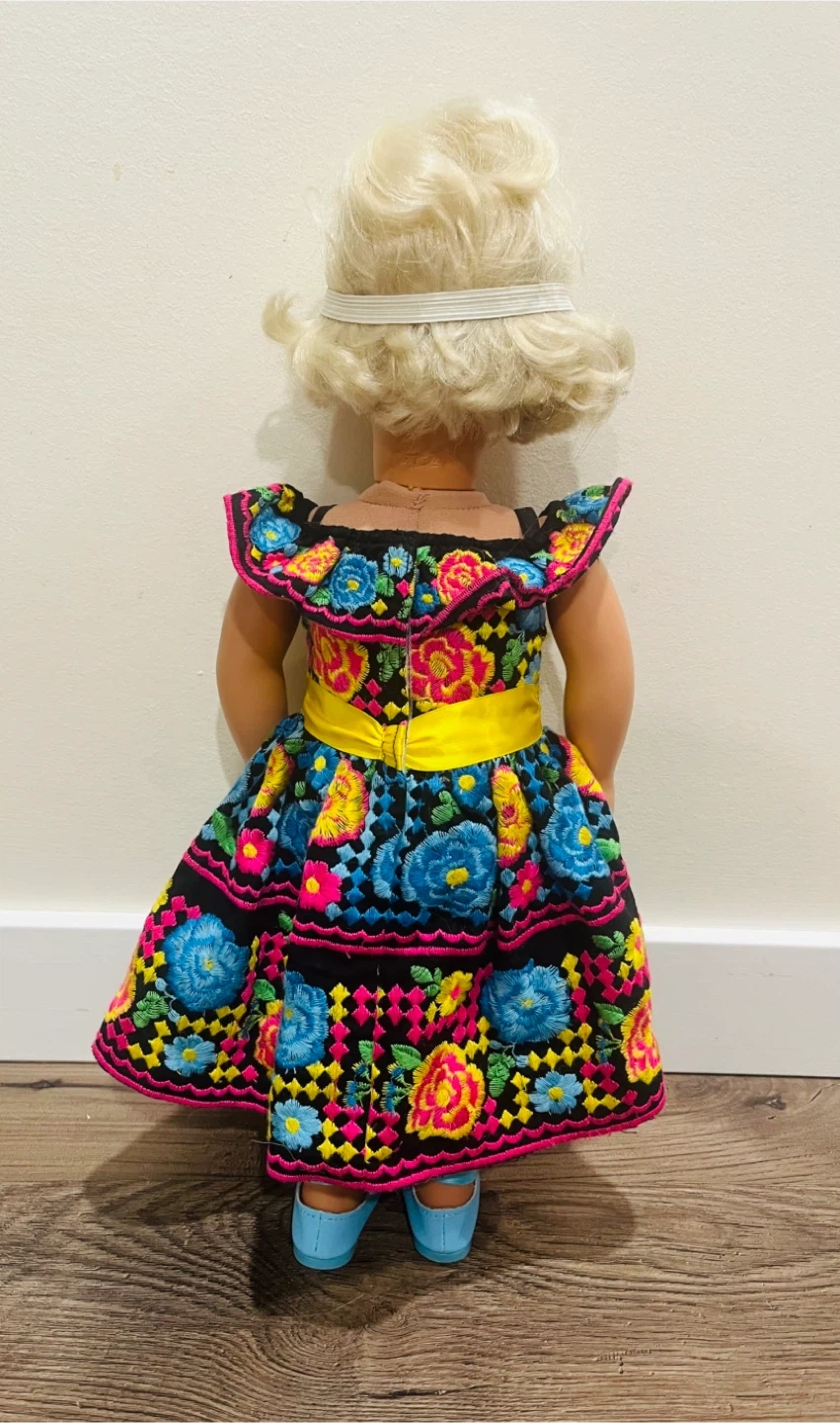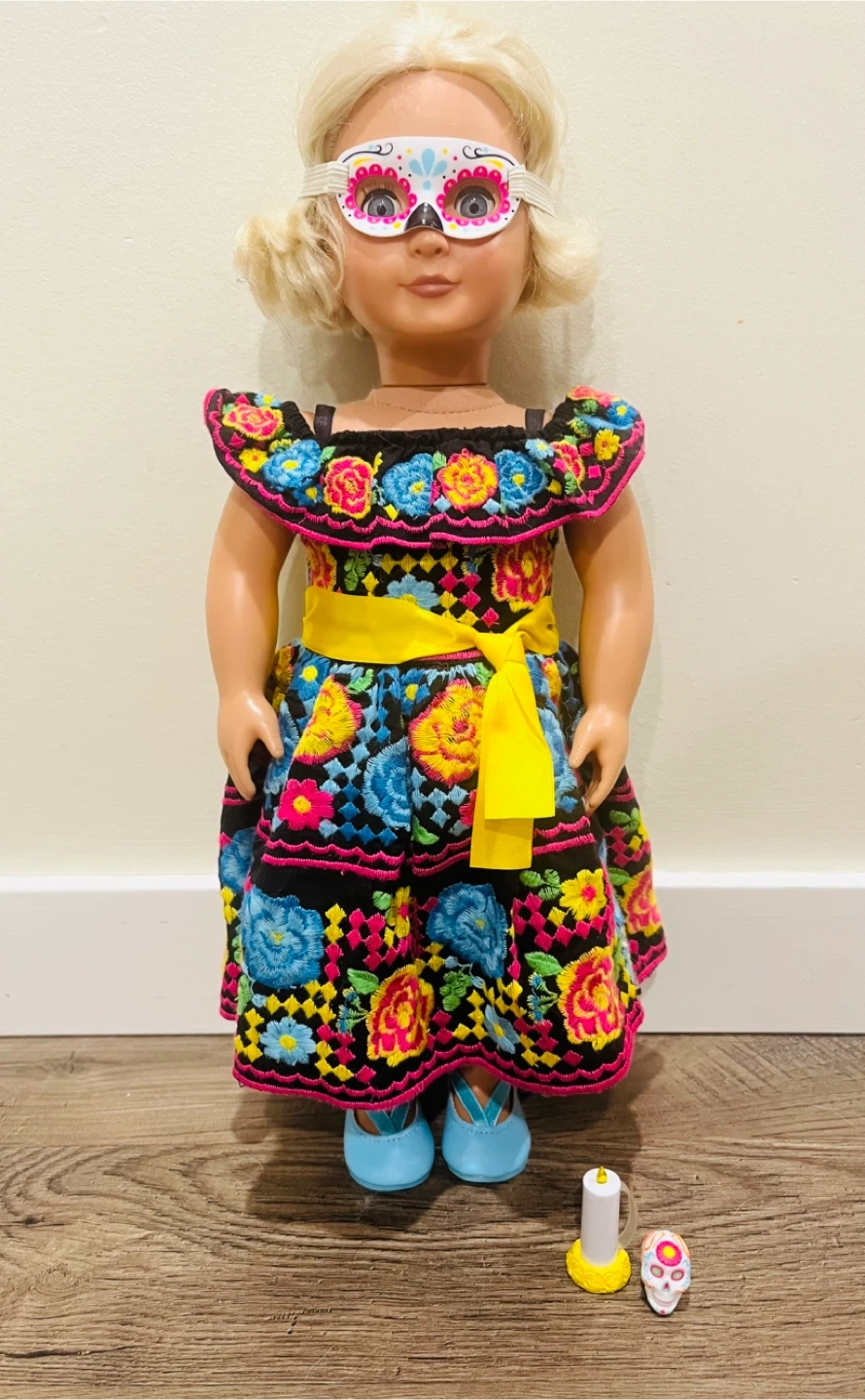 This cute Our Generation doll comes with a full day of the dead costume bought from American Girl Doll. It features a beautiful dress and masquerade mask, as well as a mini sugar skull and candle. Perfect for kids interested in Hispanic culture, or just for any kids who like dressing their dolls in fancy outfits. The doll itself is 18 inches tall and has short blonde hair and blue eyes.