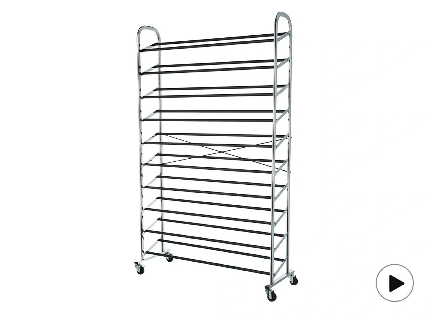 This 50-pair shoe rack offers ample storage for your footwear collection. It's made with a metal frame and has 10 tiers, with each tier holding about 5 pairs of shoes. The unit includes wheels for easy movement around your space. Its dimensions are 35.8 inches wide by 14.6 inches deep by 59.5 inches high.