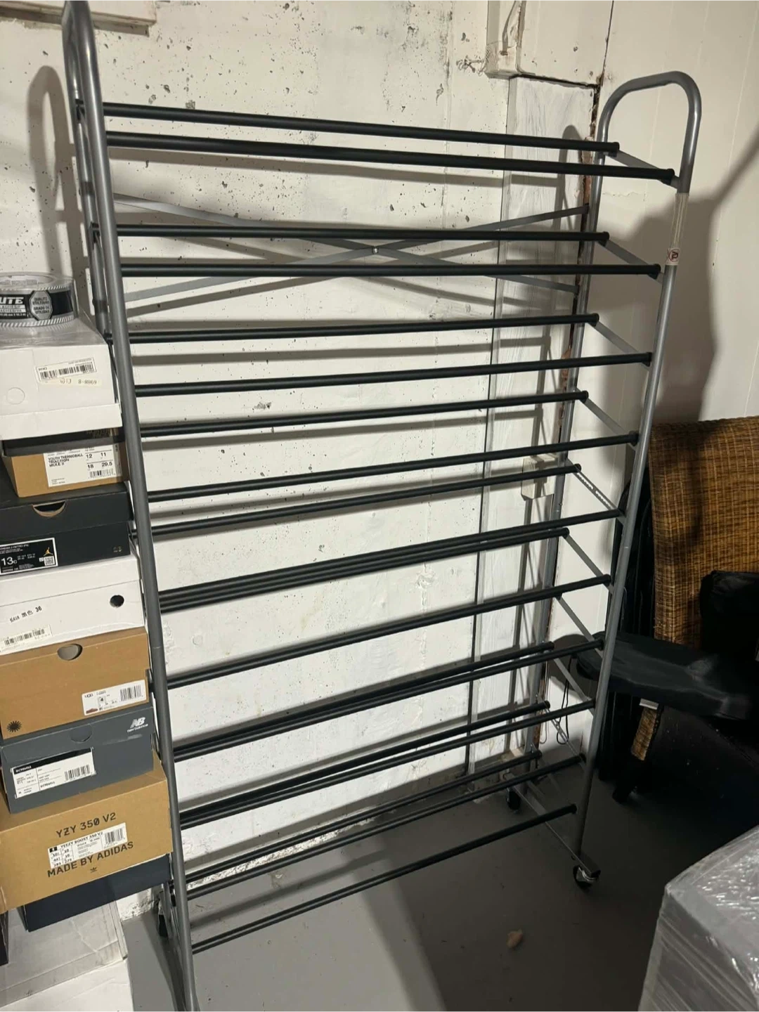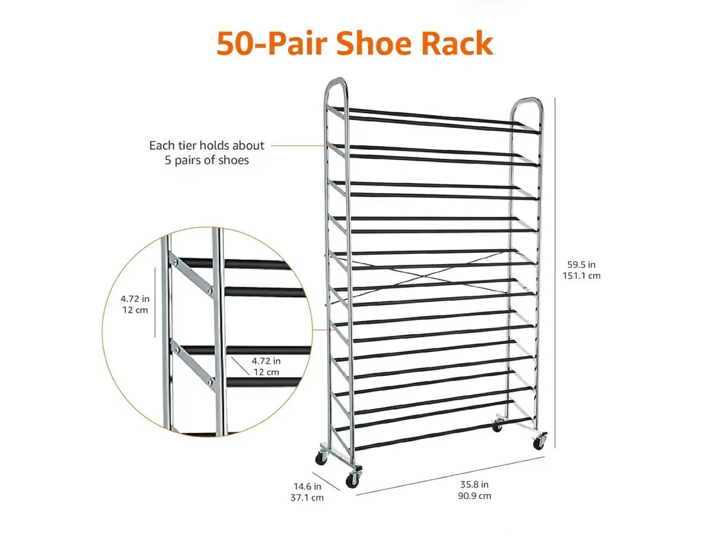 This 50-pair shoe rack offers ample storage for your footwear collection. It's made with a metal frame and has 10 tiers, with each tier holding about 5 pairs of shoes. The unit includes wheels for easy movement around your space. Its dimensions are 35.8 inches wide by 14.6 inches deep by 59.5 inches high.