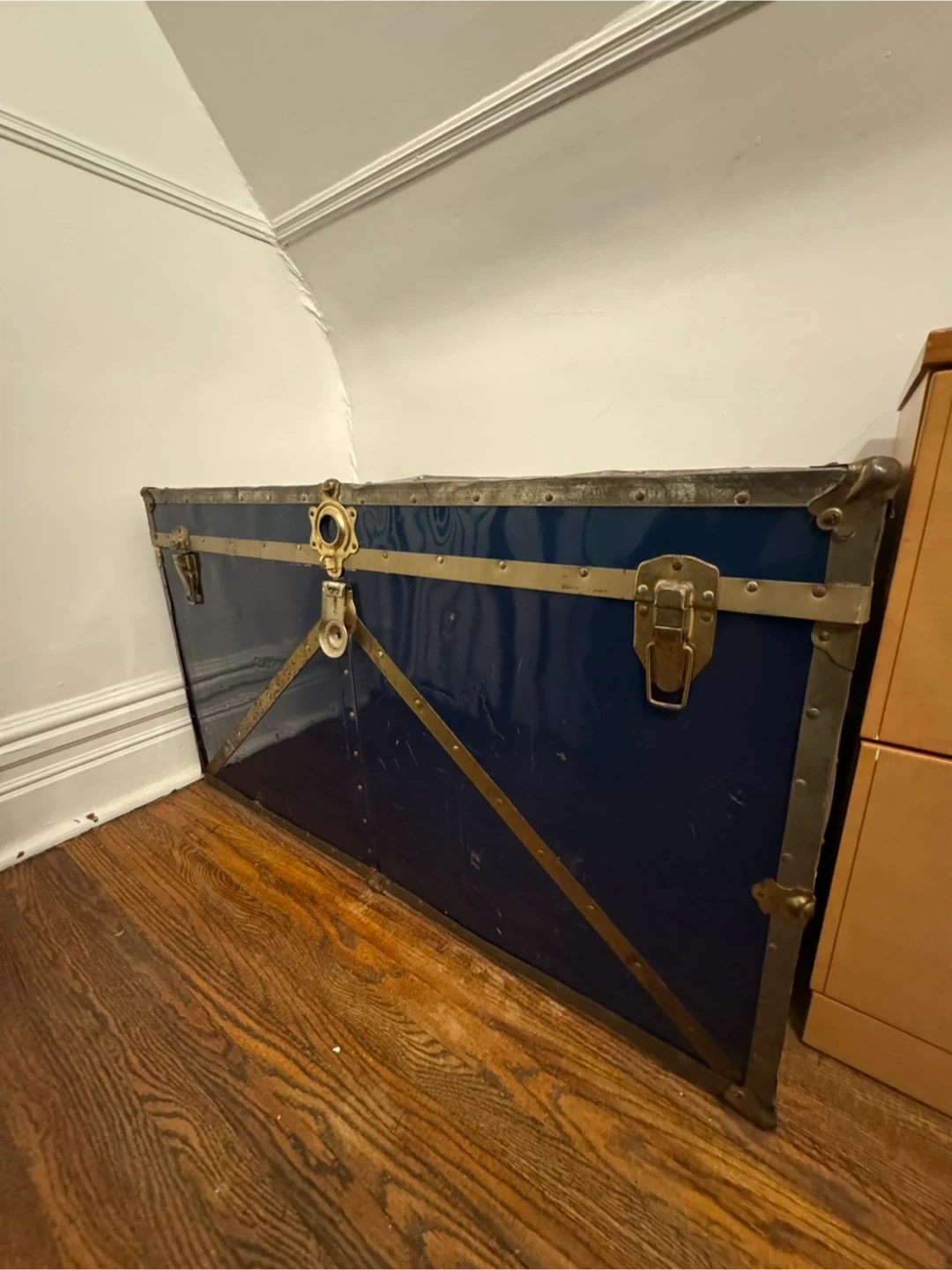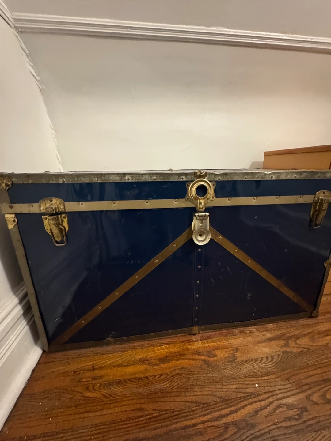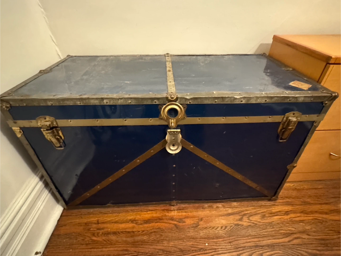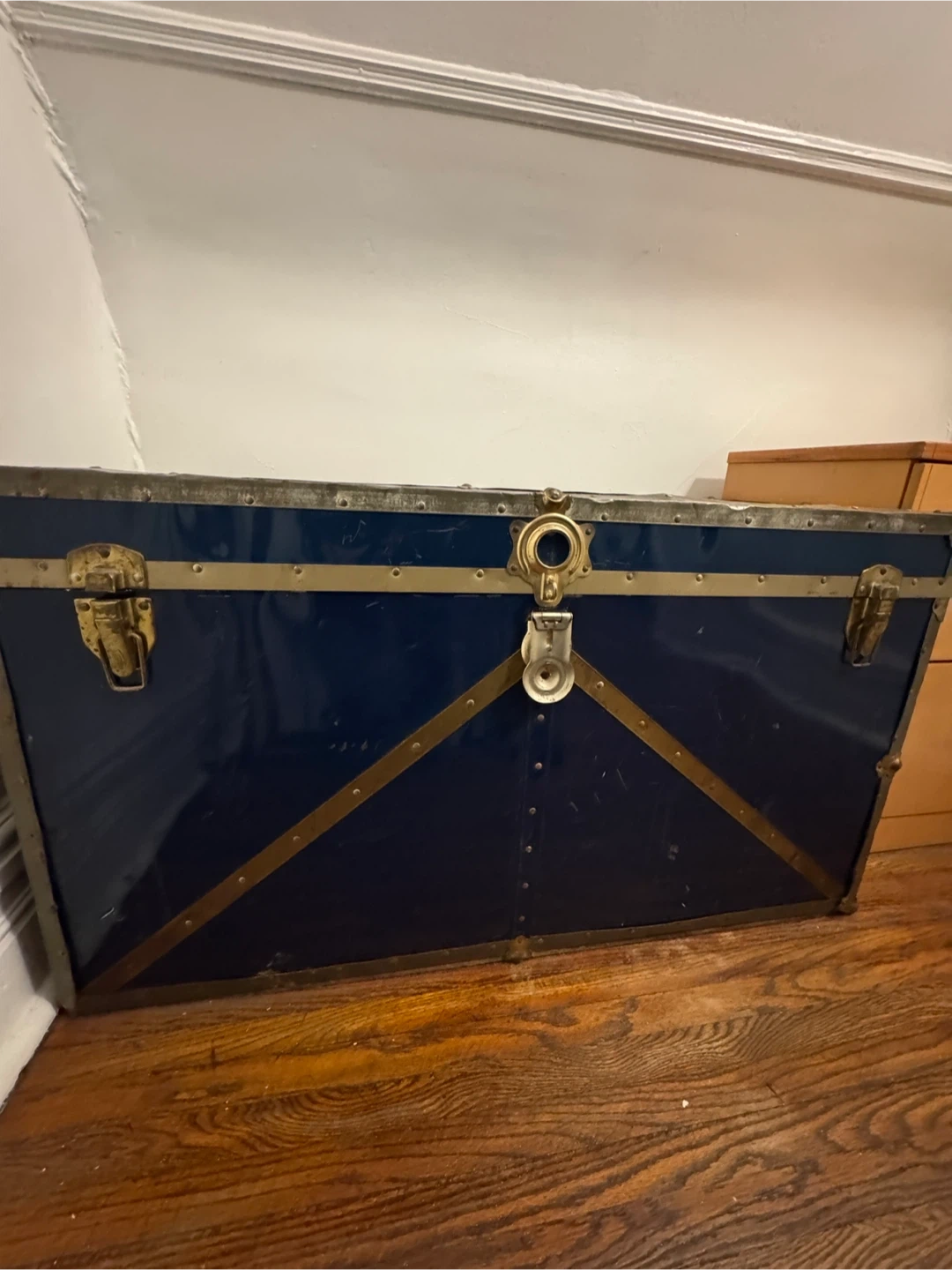 This vintage steamer trunk is a classic blue with brass accents and latches. It's a sturdy piece, perfect for storage or as a decorative item. The exterior shows some wear consistent with its age. It’s on the heavy side and measures at 43” long, 24” tall and 21” deep.