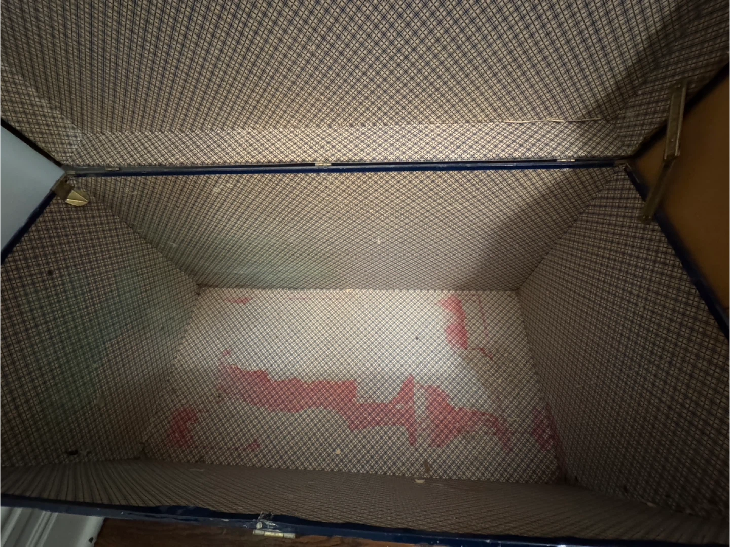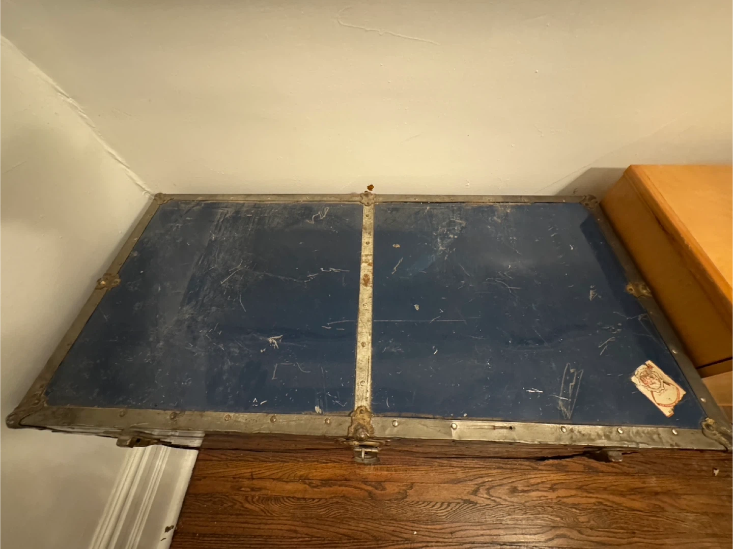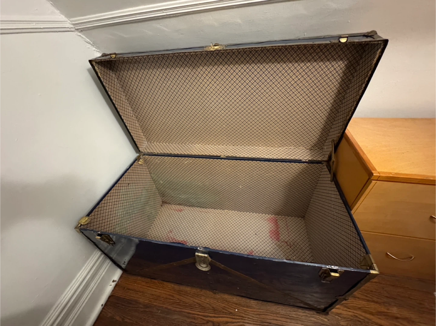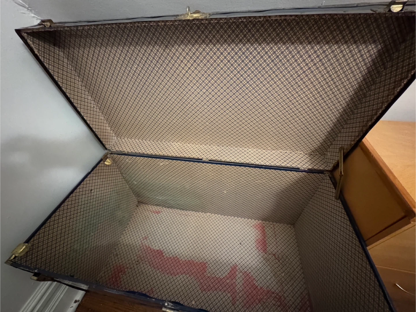 This vintage steamer trunk is a classic blue with brass accents and latches. It's a sturdy piece, perfect for storage or as a decorative item. The exterior shows some wear consistent with its age. It’s on the heavy side and measures at 43” long, 24” tall and 21” deep.