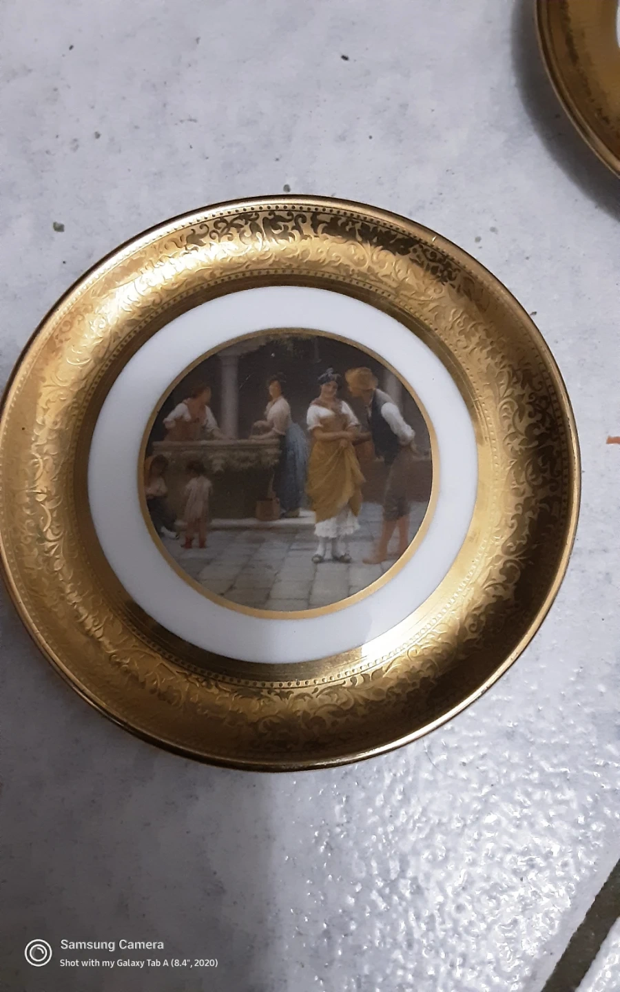 Decorative plate featuring a scene of people. Ceramic material. Gold trim accent. Made in Italy. $ 6 for 2 plants!