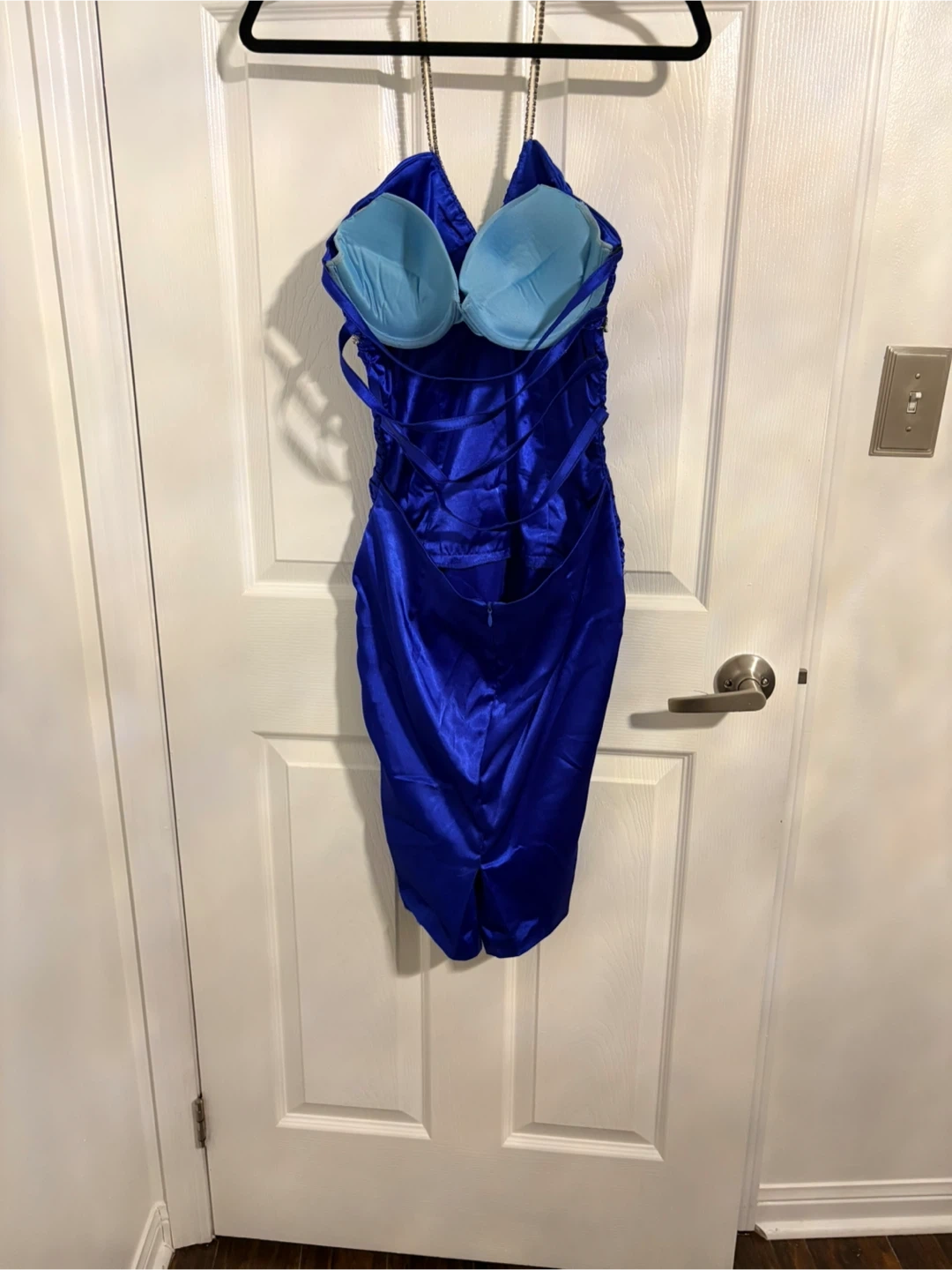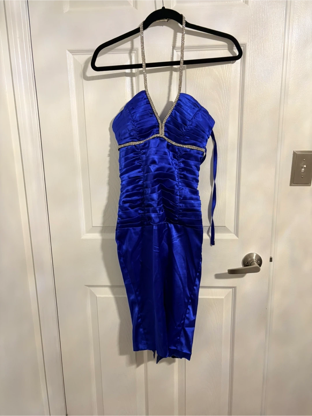 This striking royal blue dress features a ruched bodice and a flattering halter neckline adorned with rhinestones. It has a corset-style back with adjustable straps and a hidden zipper closure. The satin-like material gives it a luxurious sheen, perfect for a night out!