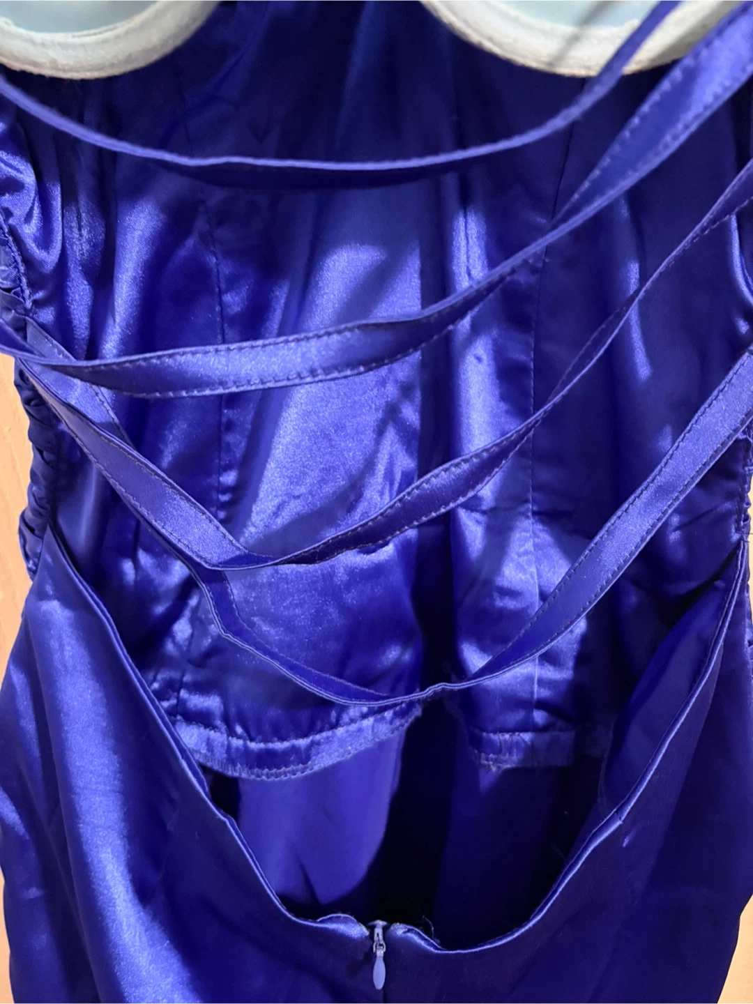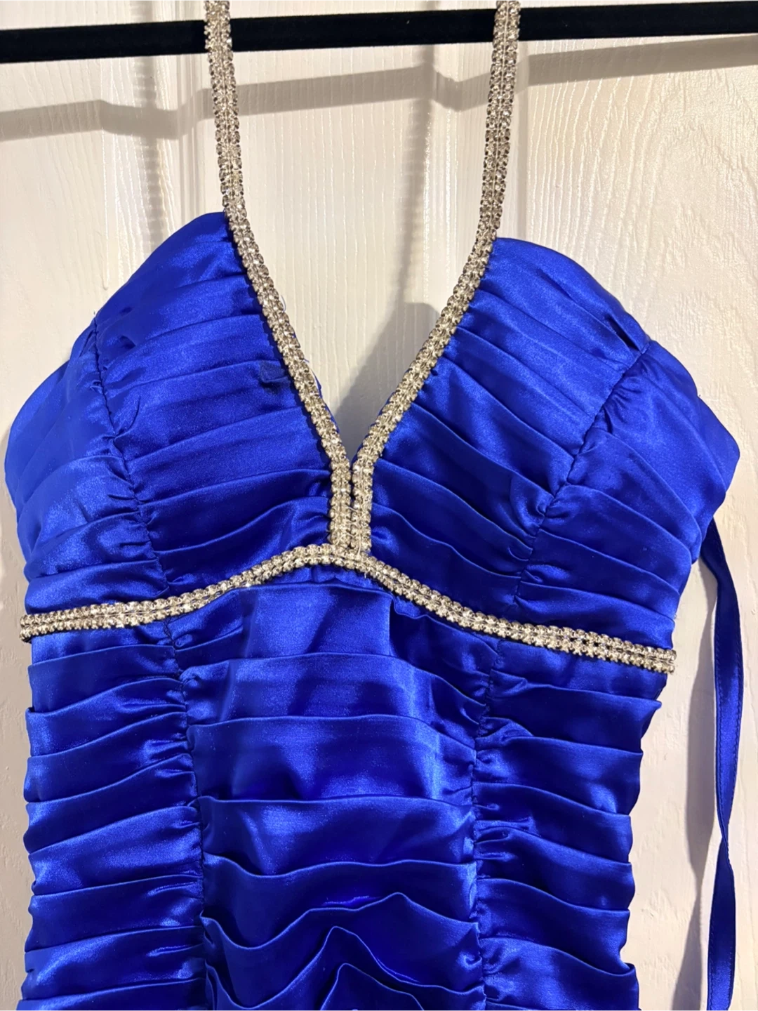 This striking royal blue dress features a ruched bodice and a flattering halter neckline adorned with rhinestones. It has a corset-style back with adjustable straps and a hidden zipper closure. The satin-like material gives it a luxurious sheen, perfect for a night out!