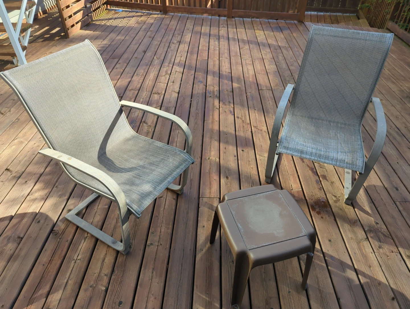 Two grey sling patio chairs with a metal frame and a matching durable plastic side table. Use it on a deck or patio for convenience! It's made for outdoor use. The chair's frame has curved arms for comfort. It's suitable for relaxing on your deck or patio.