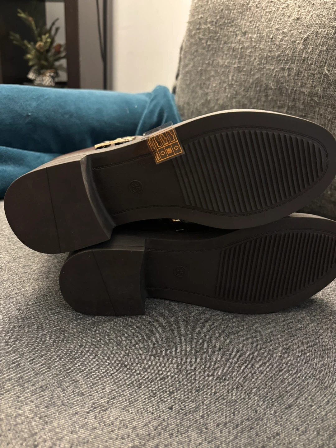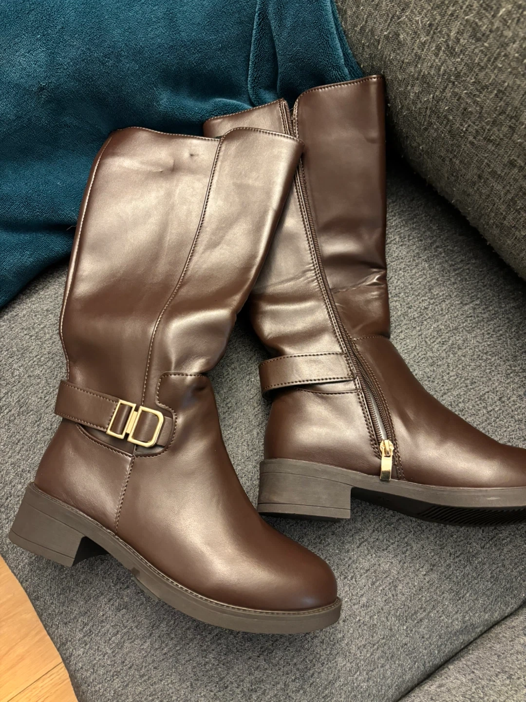 These stylish brown faux leather knee-high boots feature a buckle accent and side zipper. They have a flat sole and are a size 7. Perfect for cooler weather!