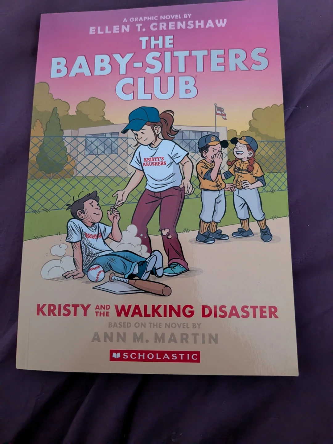 This is "Kristy and the Walking Disaster," a graphic novel from The Baby-Sitters Club series by Ellen T. Crenshaw. It's based on the novel by Ann M. Martin. This book is published by Scholastic.