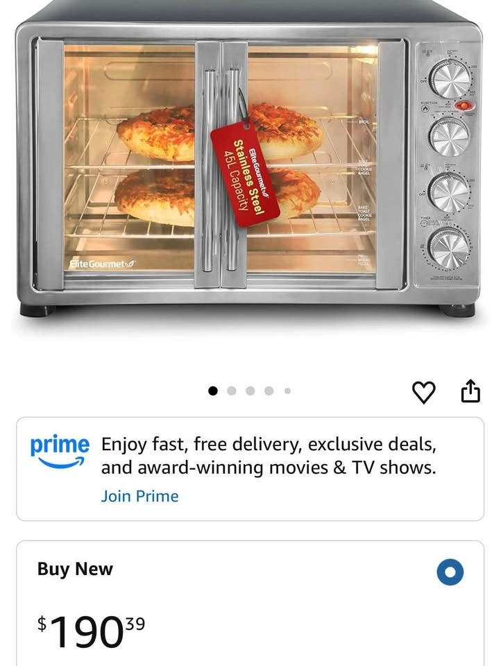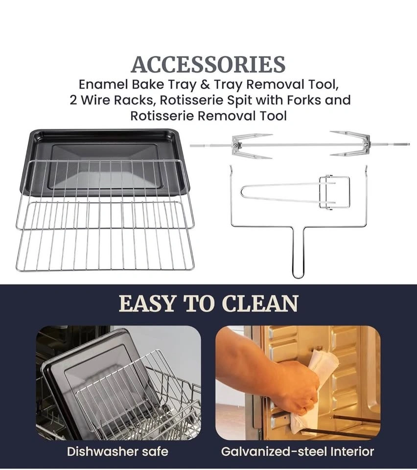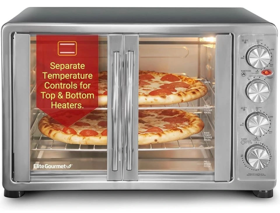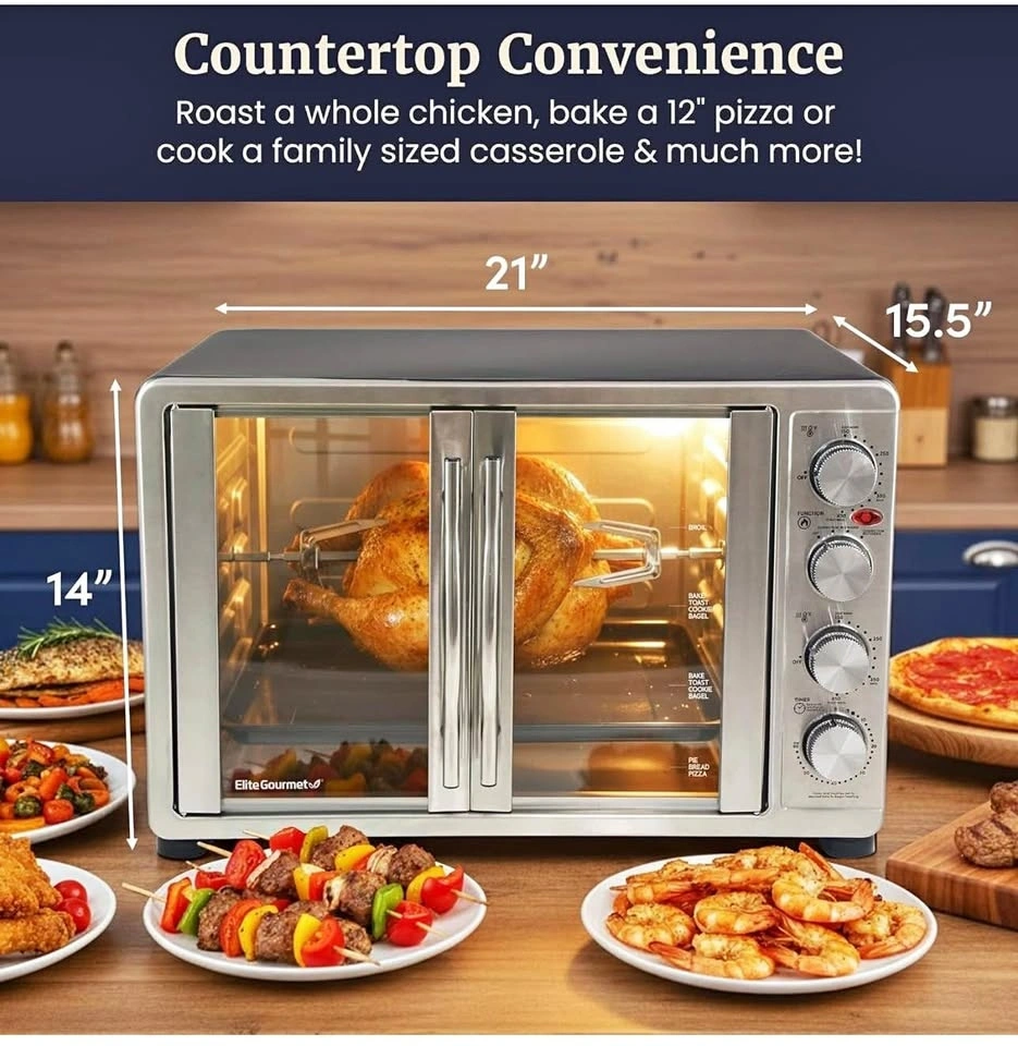 Spacious Elite Gourmet countertop convection oven in good condition. Perfect for roasting, baking, toasting, broiling, and cooking family-size meals. The large interior fits a whole chicken, pizza, casseroles, and multiple dishes at once. Back corner dented and one tire missing.