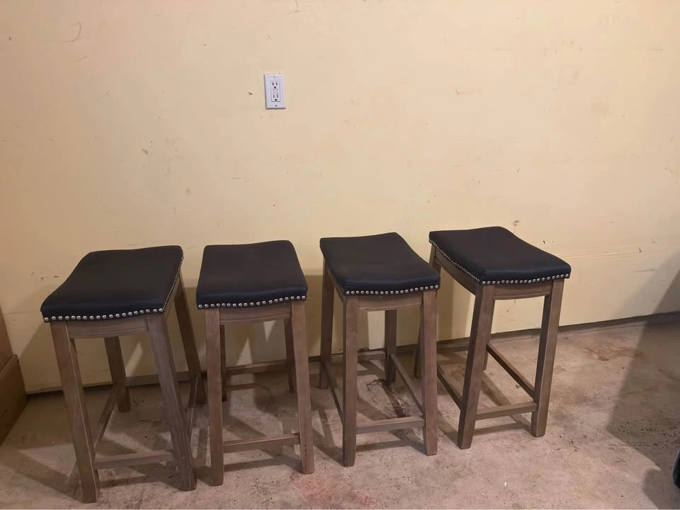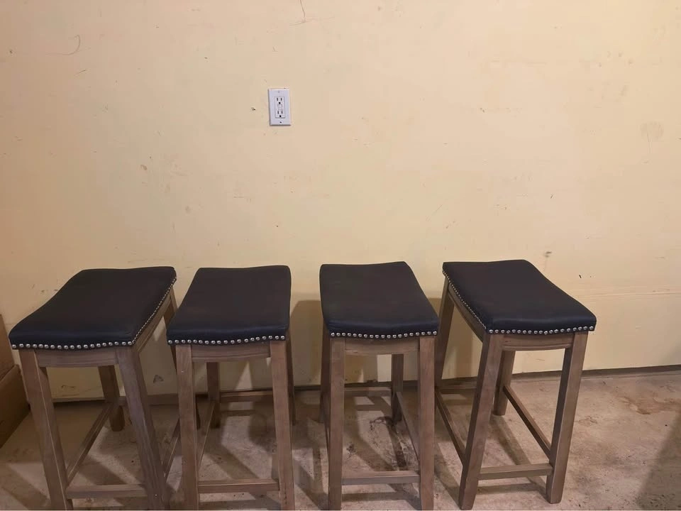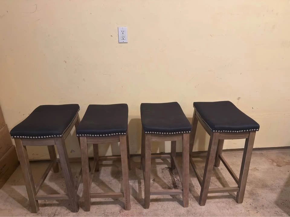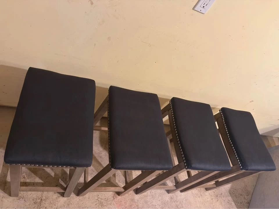 Comfortable padded seats with nailhead trim and solid wood legs. Perfect for kitchen counters, bar areas, or basement setups.
