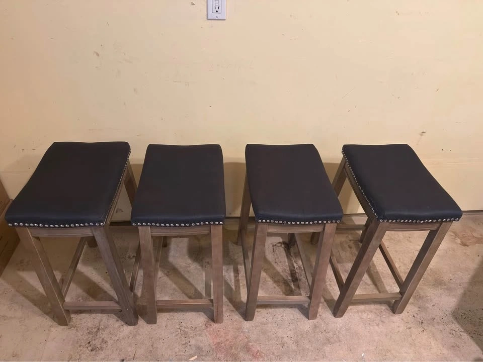 Comfortable padded seats with nailhead trim and solid wood legs. Perfect for kitchen counters, bar areas, or basement setups.