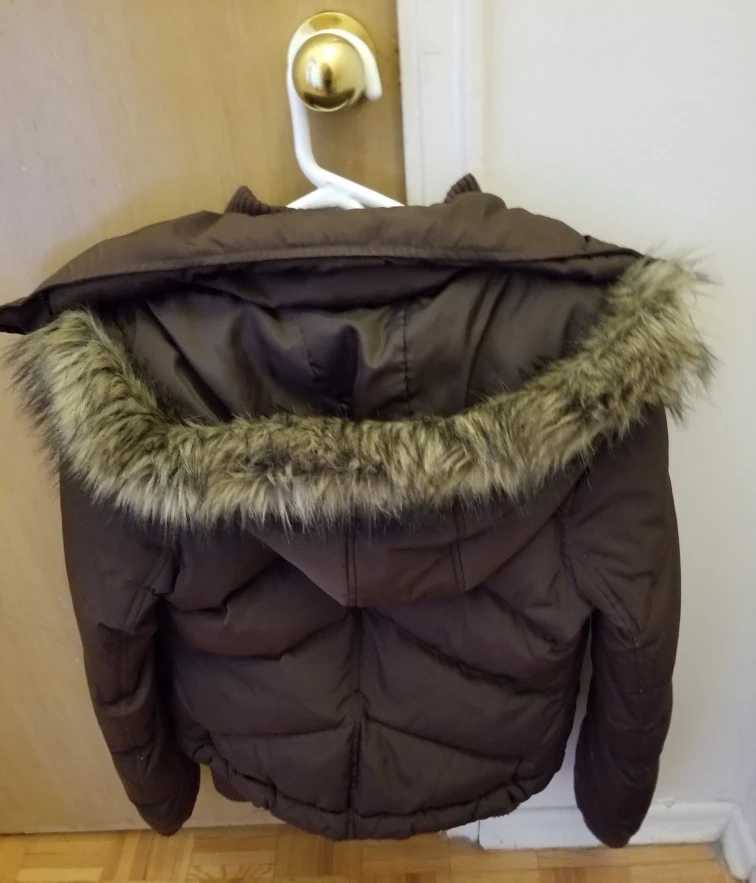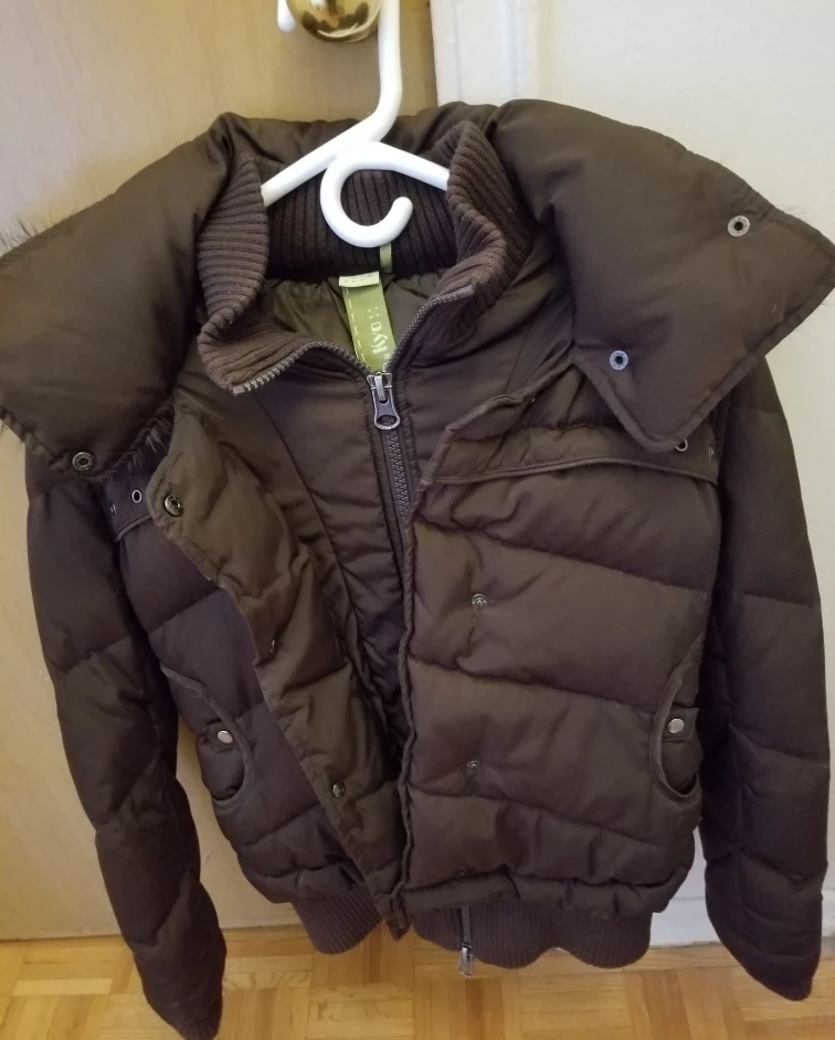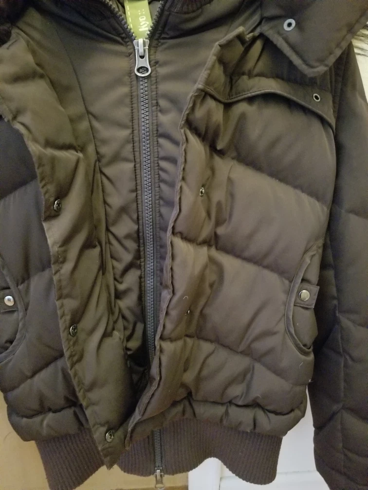 Gorgeous dark brown ladies winter down-filled puffer jacket, with detachable hood.
