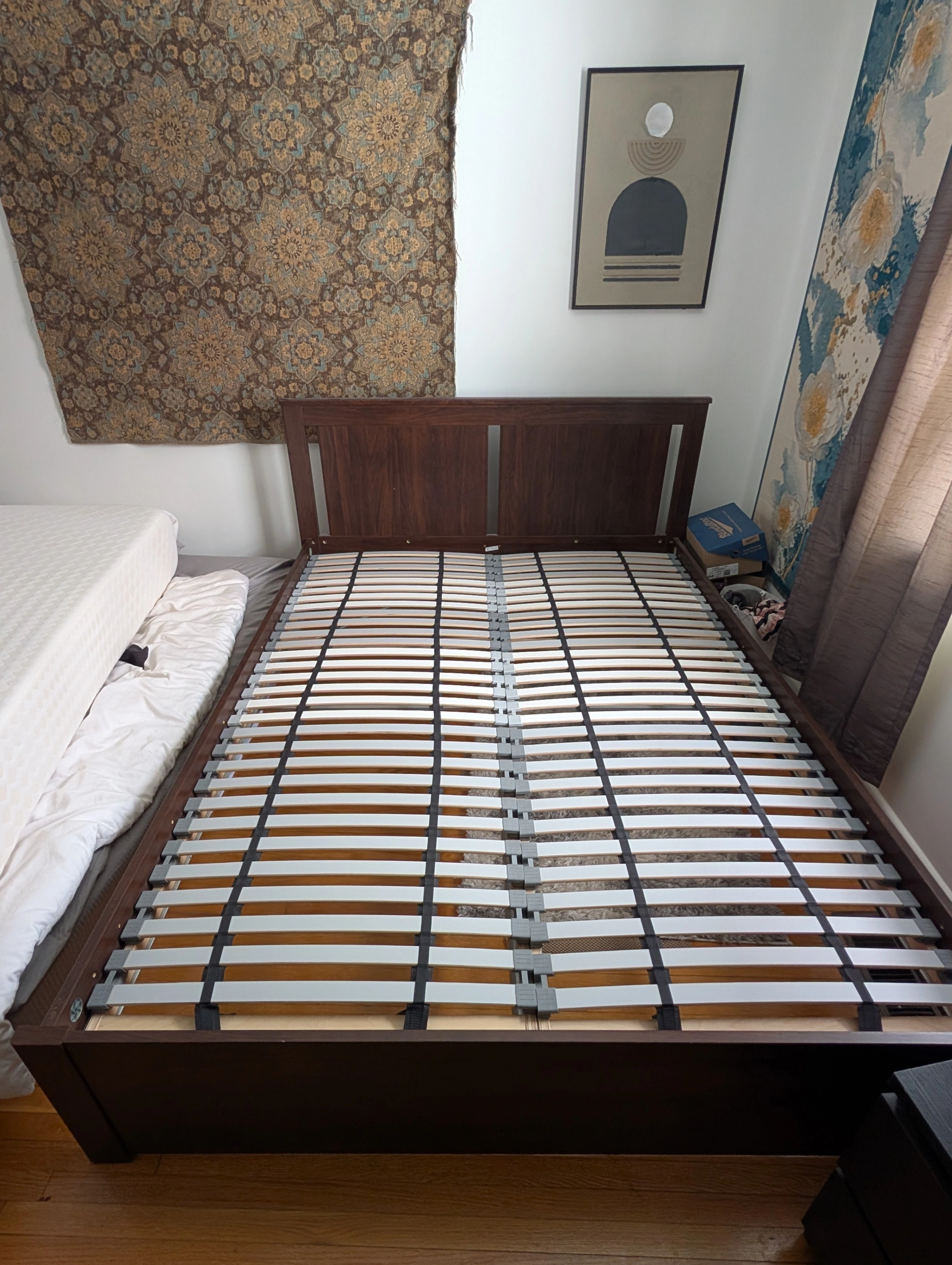 Ikea Songesand Queen sized frame in brown, Luroy slats, and a good condition 10" firm Ashley Signature Design memory foam mattress.