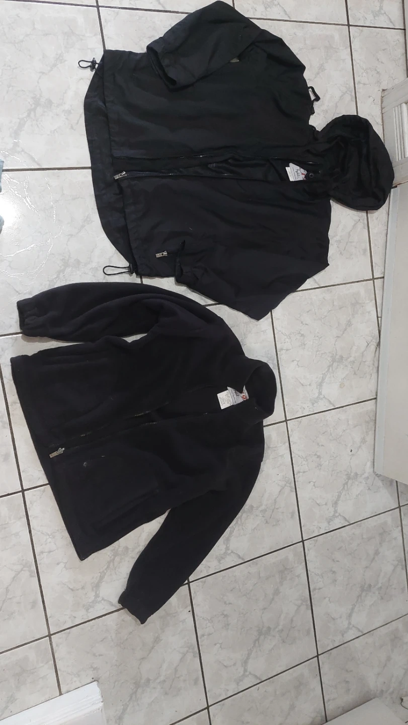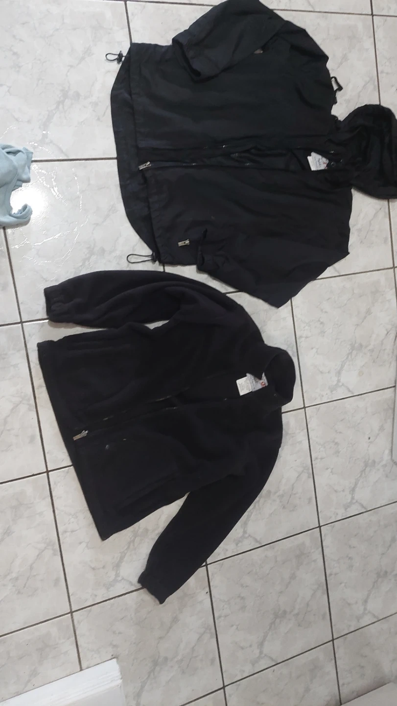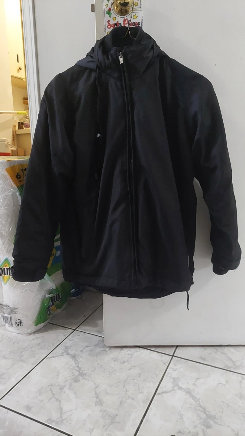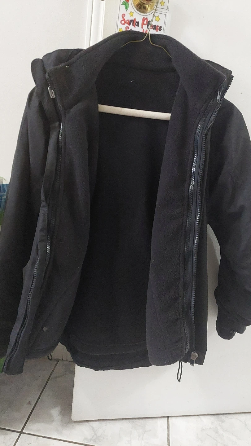 Two-in-one black jacket featuring a removable fleece liner. The outer shell is weather-resistant with a hood and zippered pockets. Both pieces zip together for extra warmth.