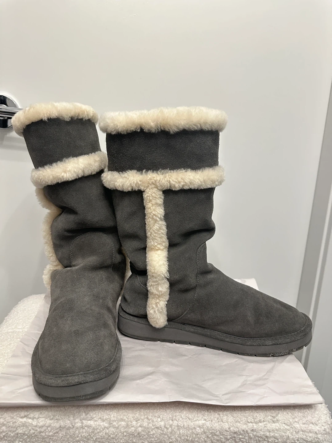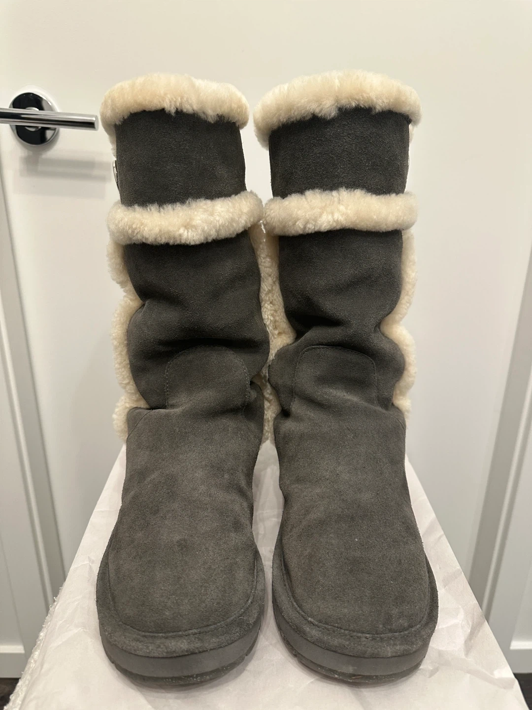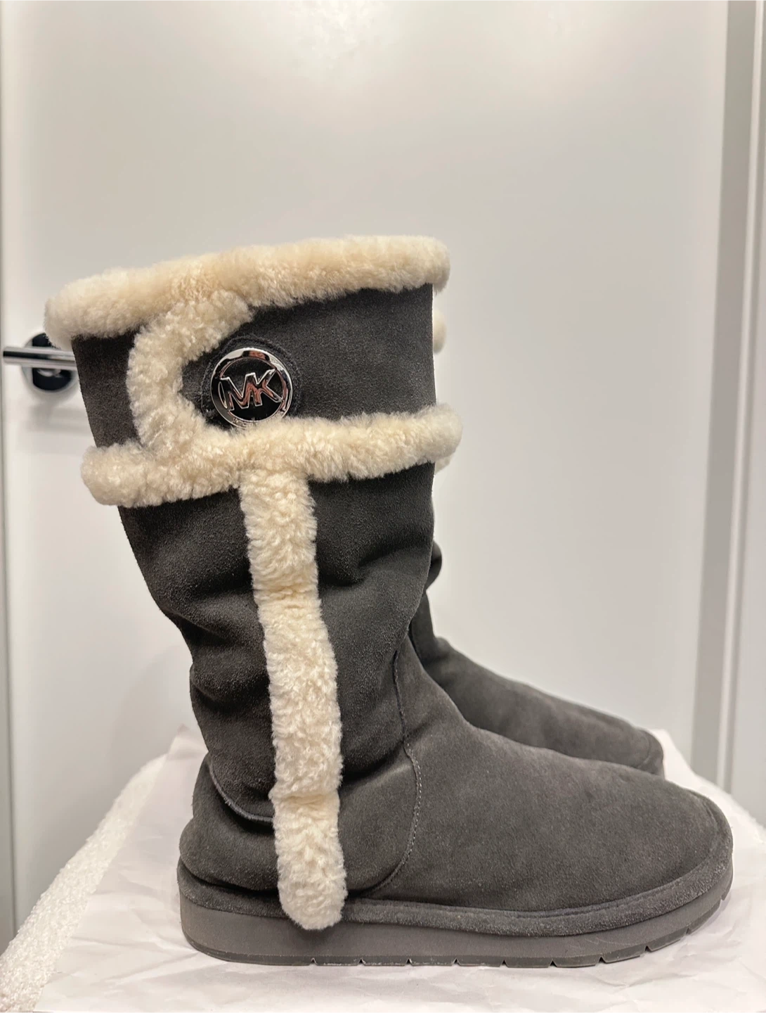 Stylish Michael Kors boots crafted from grey suede with cozy shearling trim. These mid-calf boots are perfect for keeping warm and looking fashionable during cooler months.