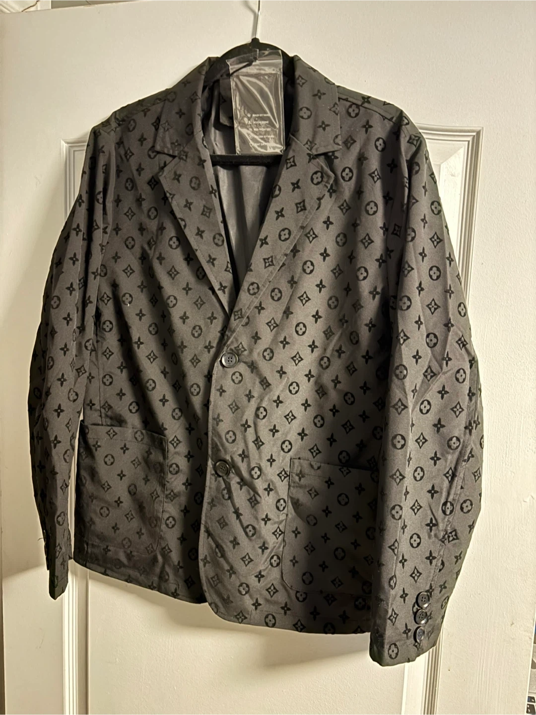 Stylish blazer featuring a repeating designer-inspired print. It's a dark grey colour with black monogram pattern. Includes button closure and front pockets.
