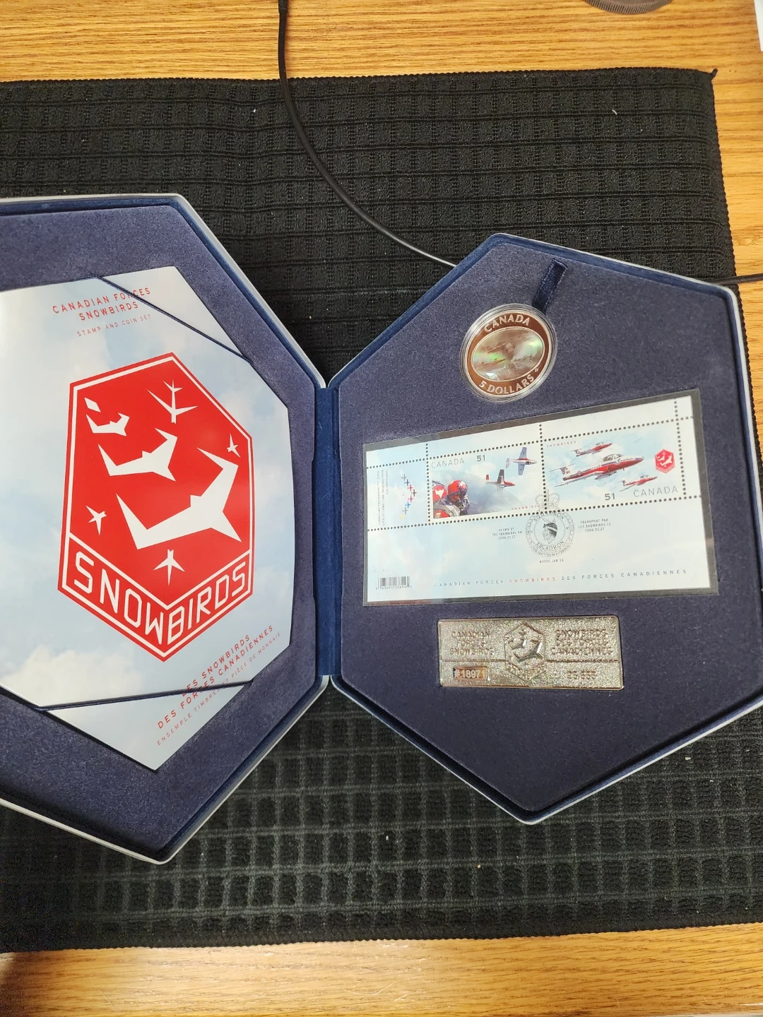 Selling a Canadian Forces Snowbirds Stamp and Coin Set! It includes a $5 coin, stamps, and a commemorative metal piece. The set comes in a presentation box.