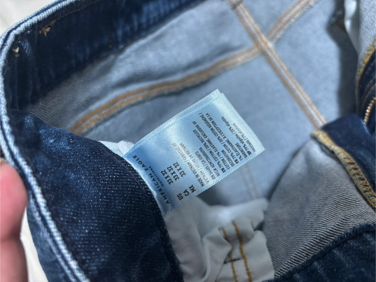 American Eagle men's jeans in a classic blue wash. They're made with 79% cotton, 19% polyester, and 2% elastane for a comfortable stretch. Size 33x32. These jeans are ready for everyday wear!