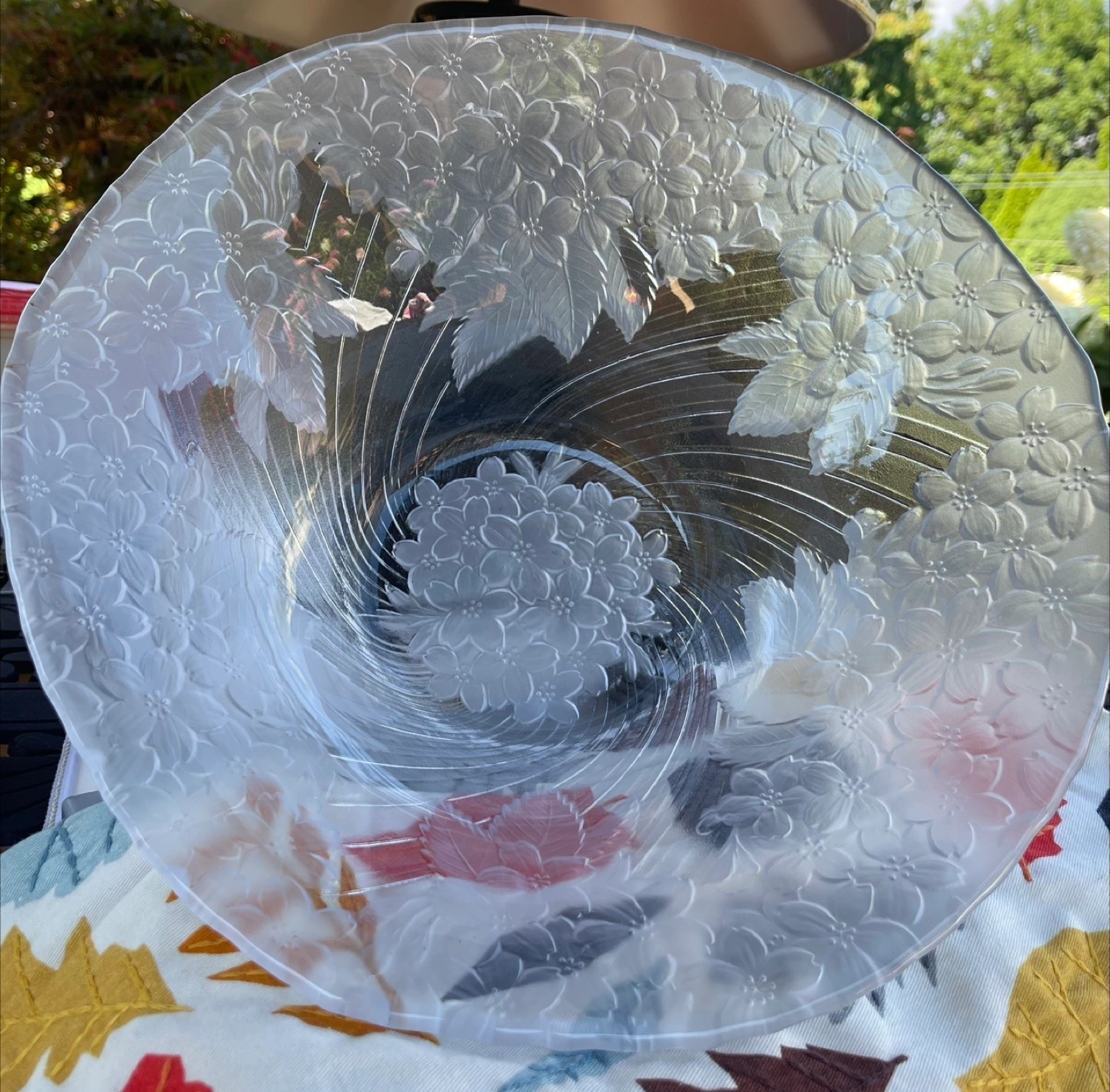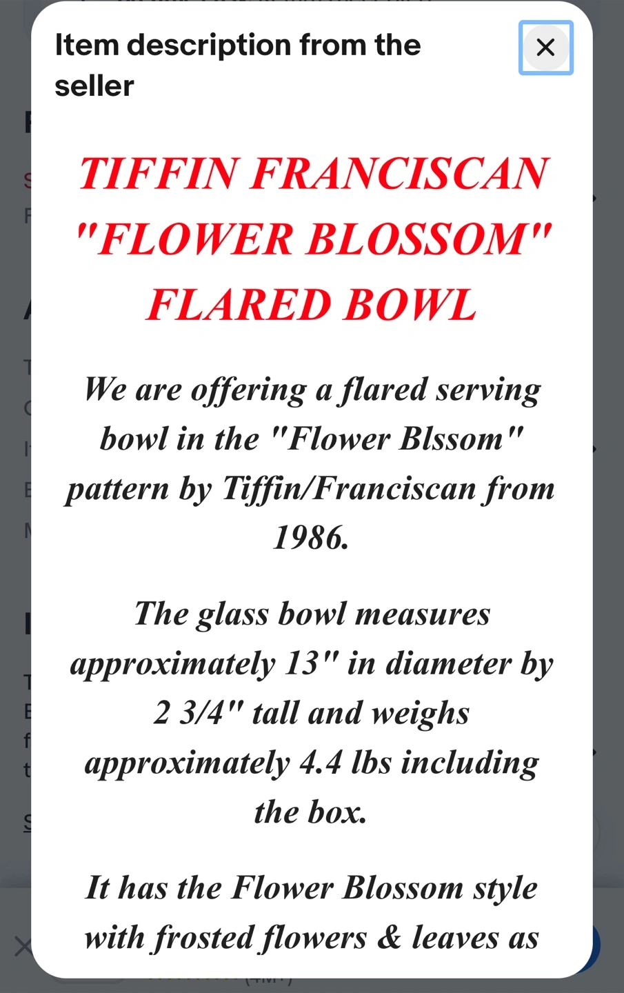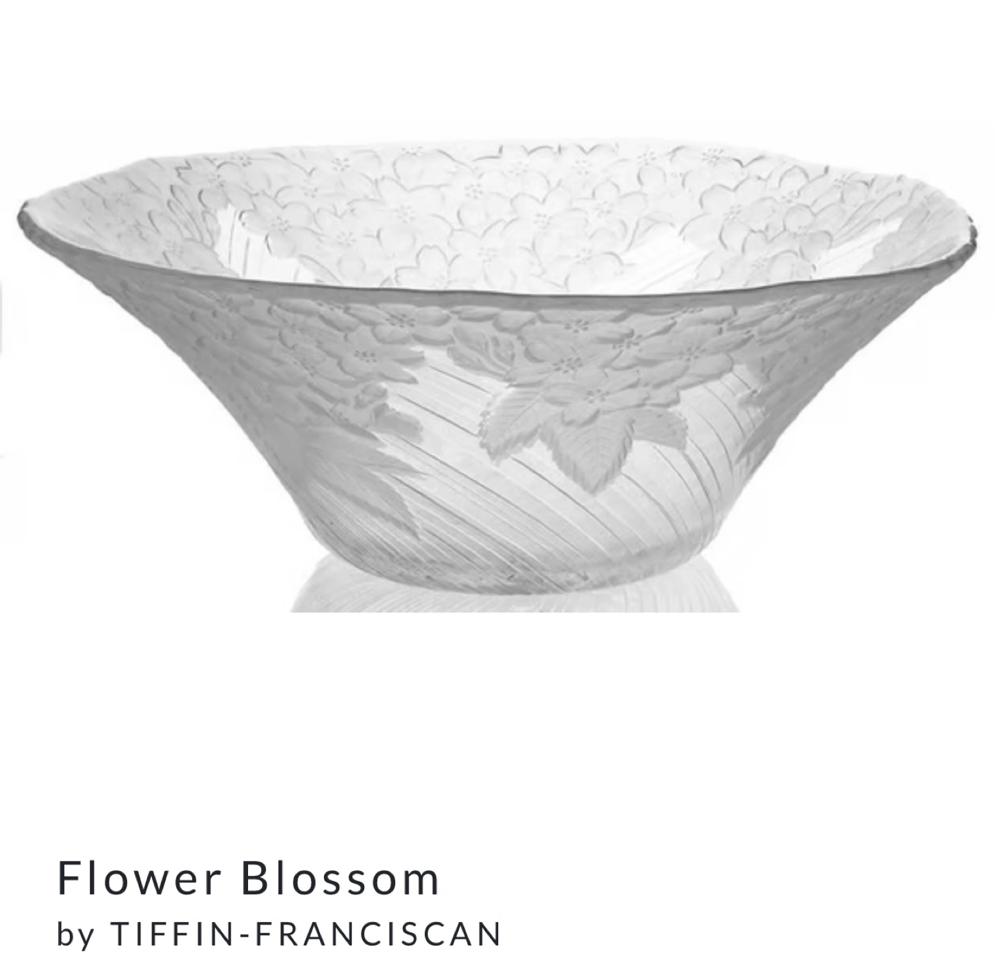 Selling a beautiful Tiffin Franciscan flared serving bowl in the Flower Blossom pattern. This elegant glass bowl measures approximately 13 inches in diameter and 2 3/4 inches in height. It features a lovely Flower Blossom style with frosted flowers and leaves. A timeless piece to add to your collection!