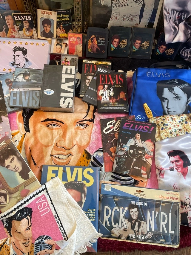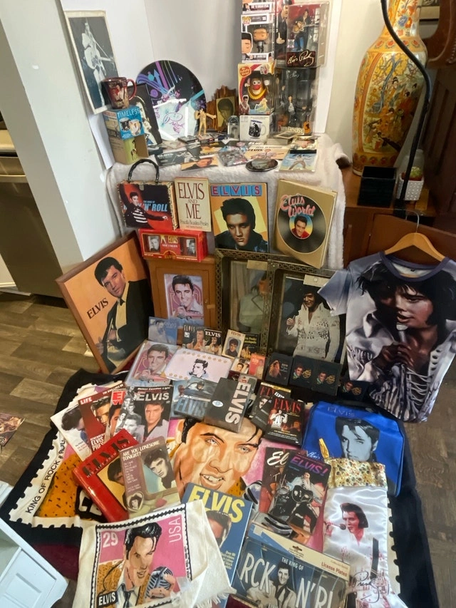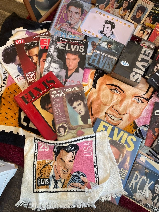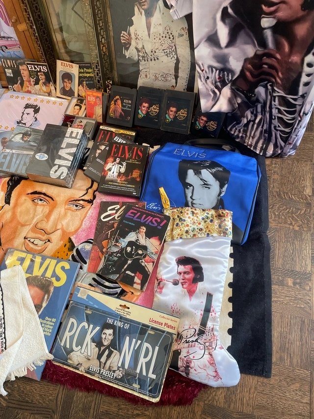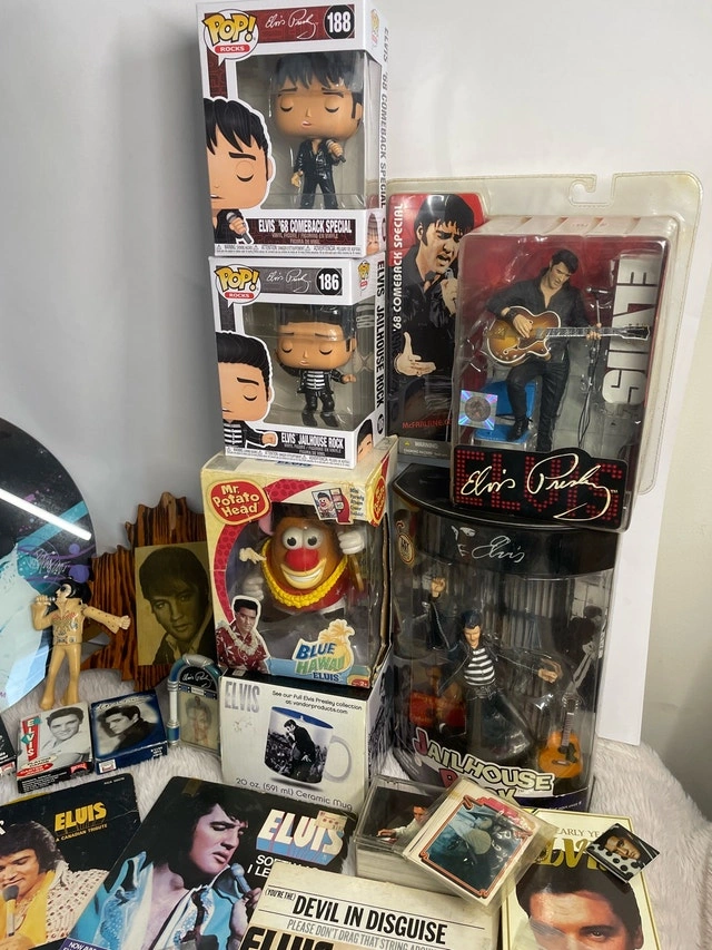 Massive Elvis Presley collection including books, 45s, magazines, license plates, blankets, pictures, Funko figures, figurines, cups, keychains, a clock, and playing/trading cards. Pickup available in the Bayview Davisville area. Please check out my other listings for more treasures!