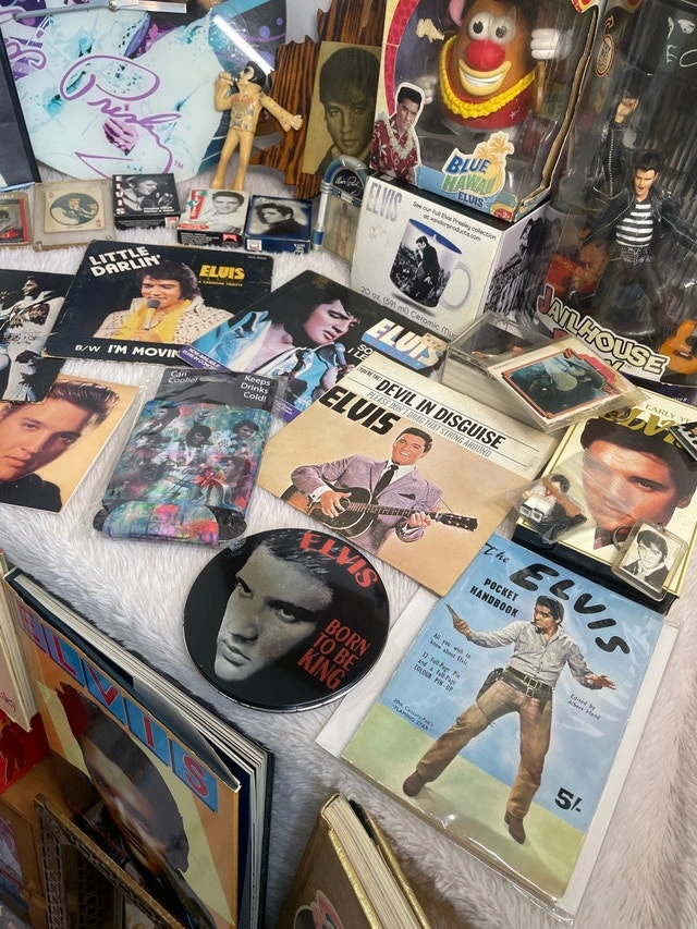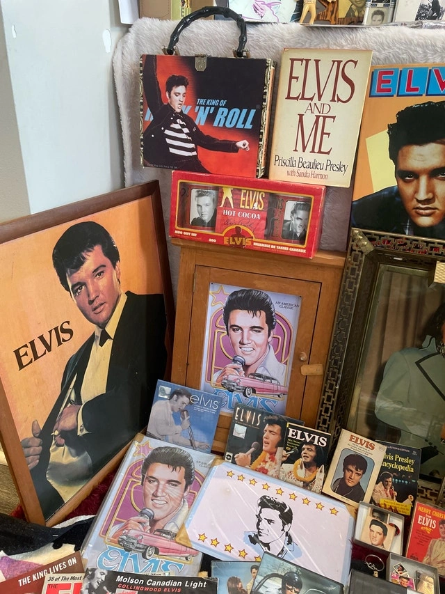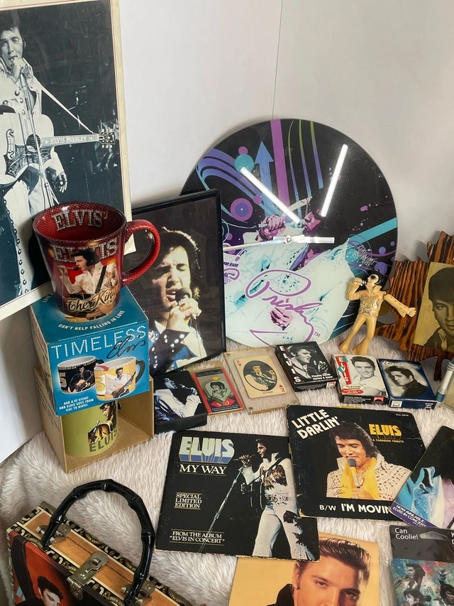 Massive Elvis Presley collection including books, 45s, magazines, license plates, blankets, pictures, Funko figures, figurines, cups, keychains, a clock, and playing/trading cards. Pickup available in the Bayview Davisville area. Please check out my other listings for more treasures!