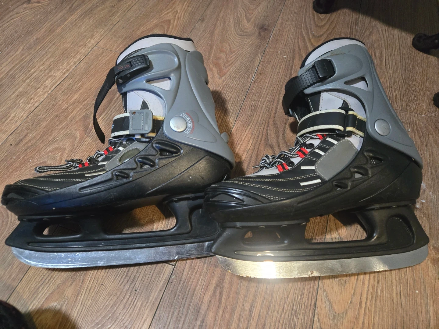 Adjustable youth/adult ice skates with quick lock buckles and laces. Features a supportive boot design and durable blades. Adjustable size feature for growing feet.