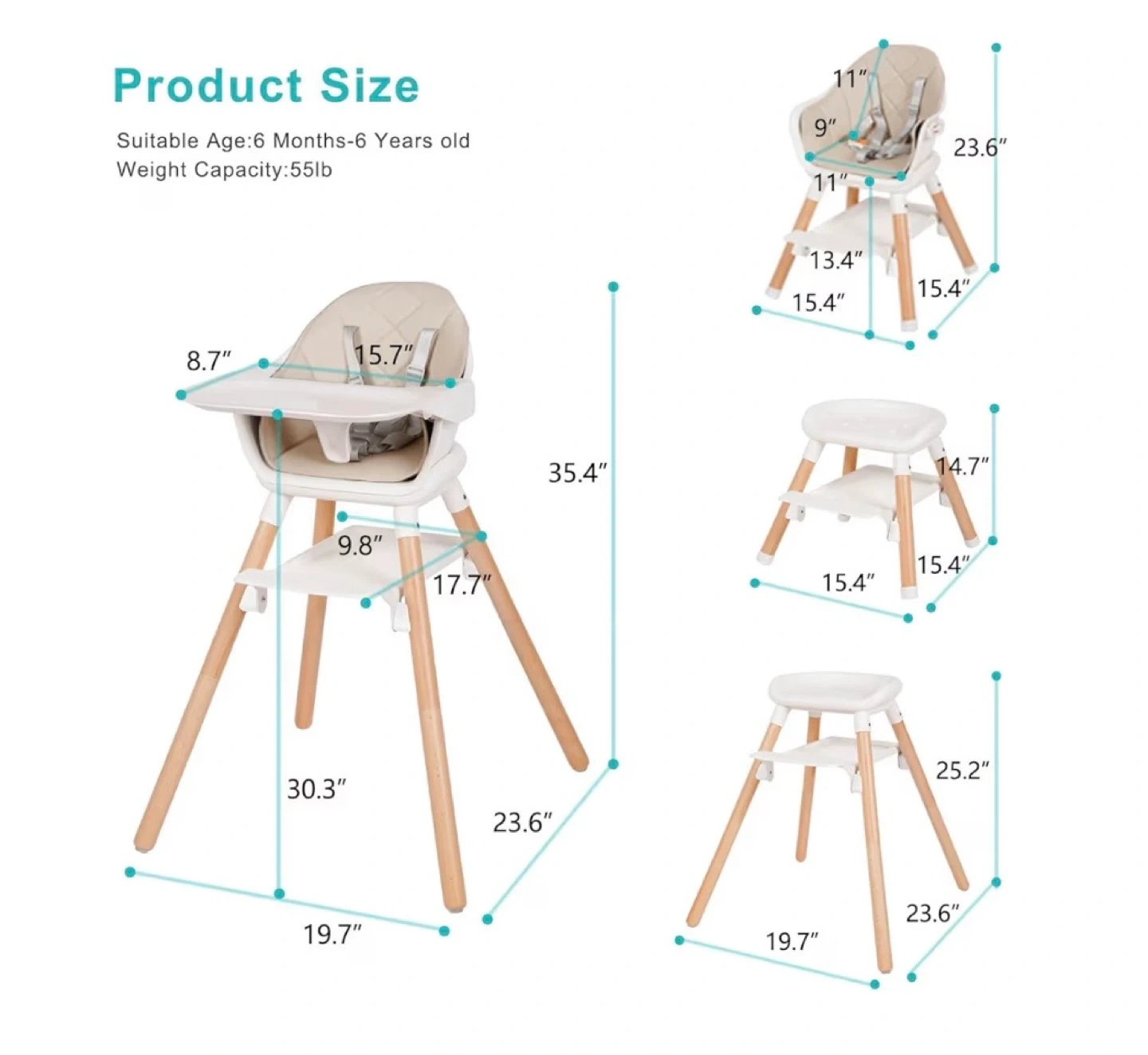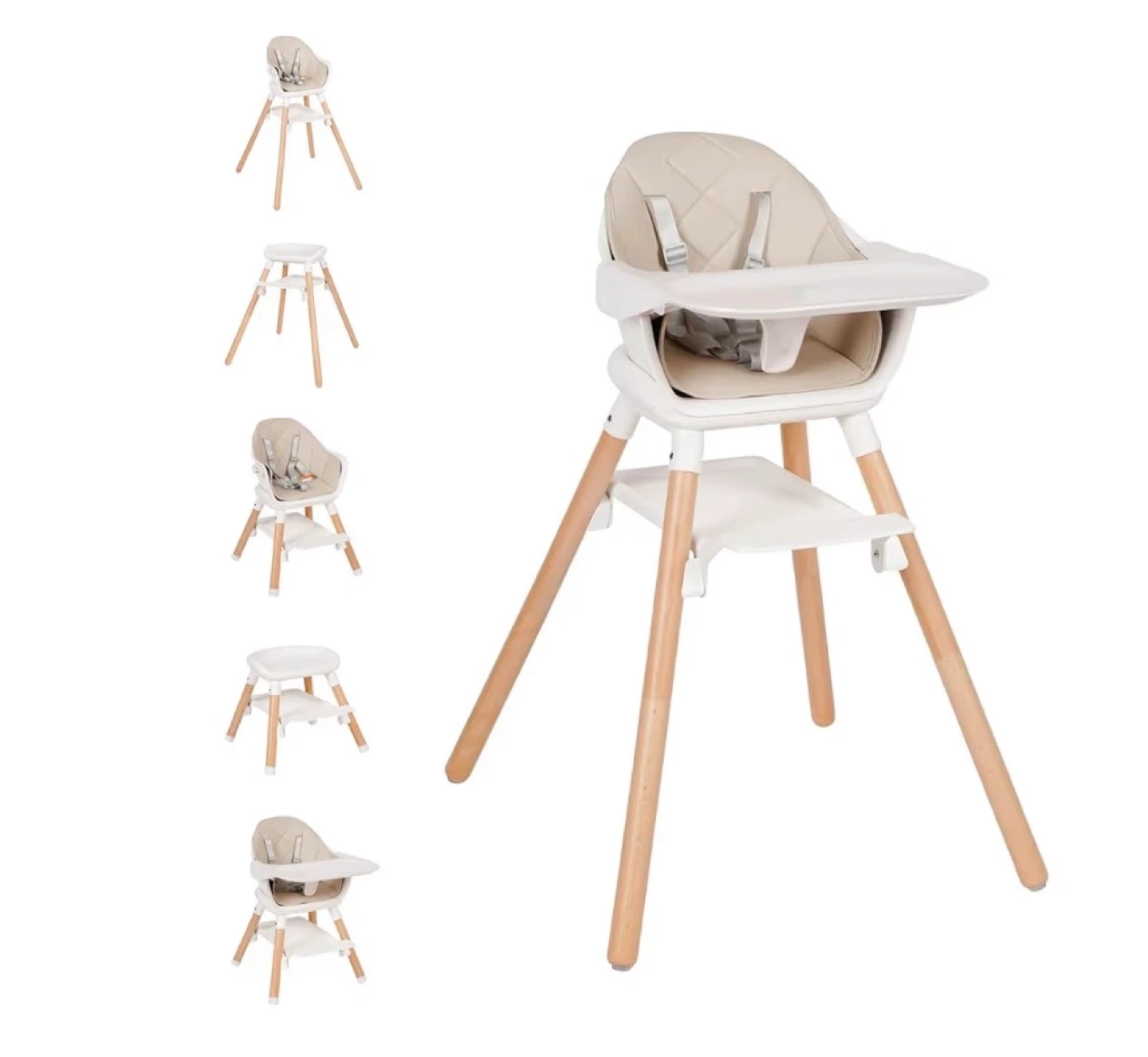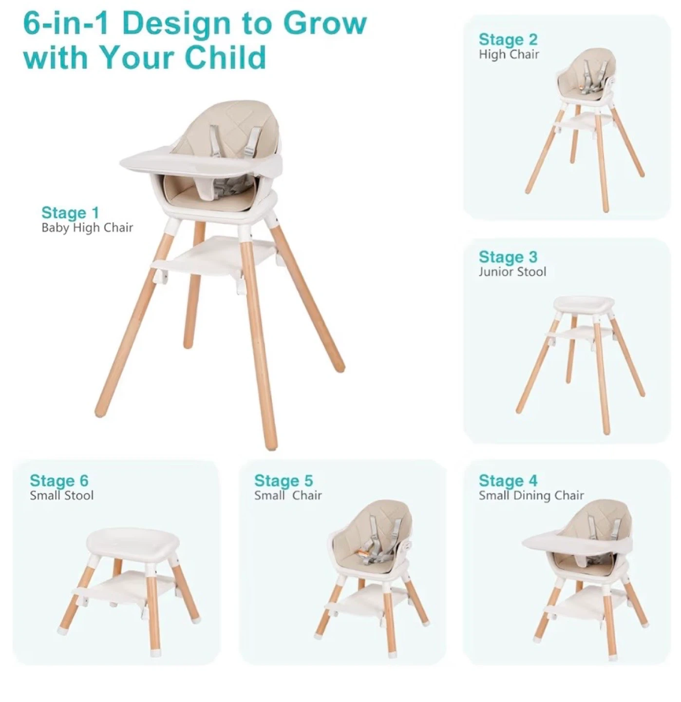 This brand new, factory-sealed 6-in-1 wooden convertible high chair in beige offers versatility as your child grows, transitioning from a baby high chair to a junior stool and beyond, supporting children from 6 months to 6 years with a weight capacity of up to 55lbs! This convertible design ensures longevity and adapts to your child's changing needs.