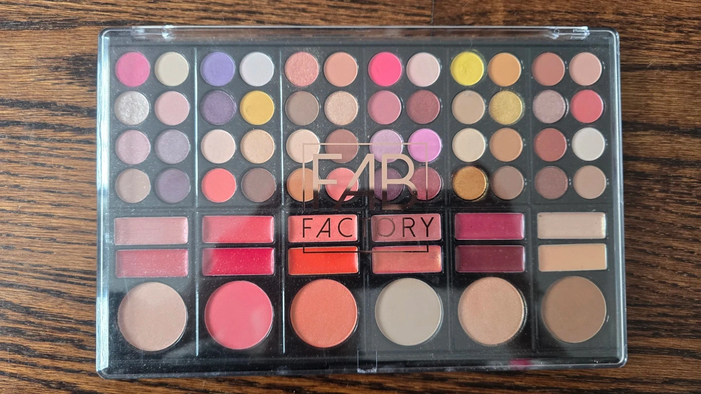 - FAB Factory eyeshadow palette with multiple shades of eyeshadow, blush, and pressed powder.