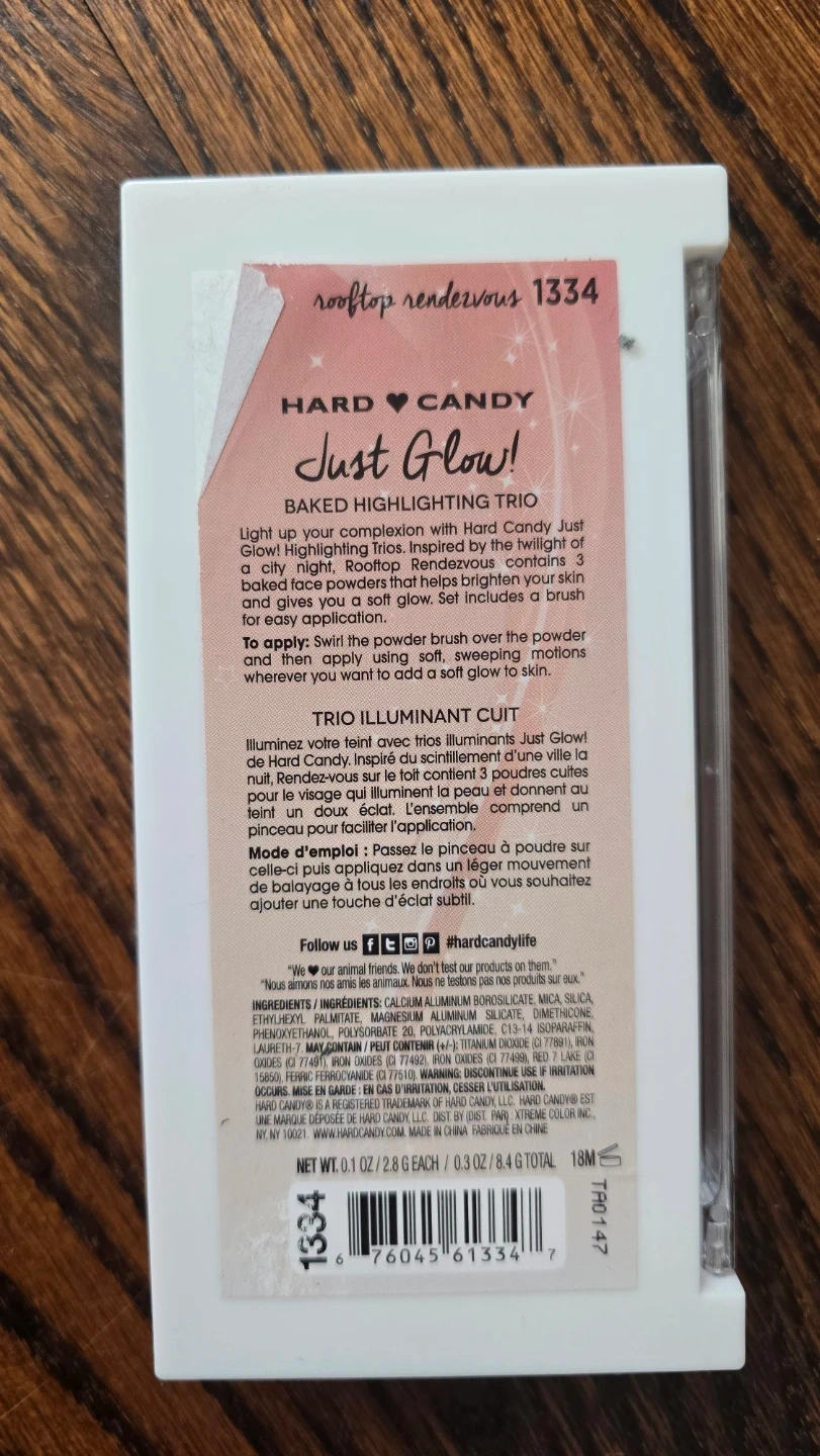 - Hard Candy Baked Glow Trio in Rooftop Rendezvous 1334 with three highlighting powders.